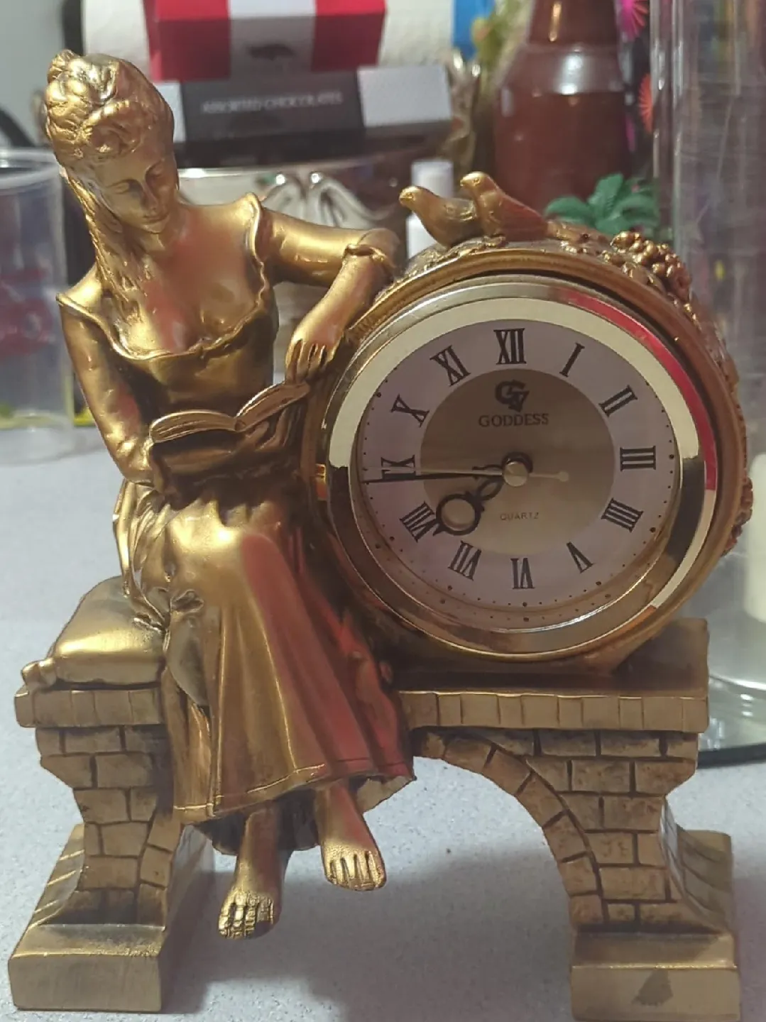This is a beautiful Goddess quartz table clock. It features a lovely gold finish and a unique design with a woman reading a book. It would make a great addition to any room!