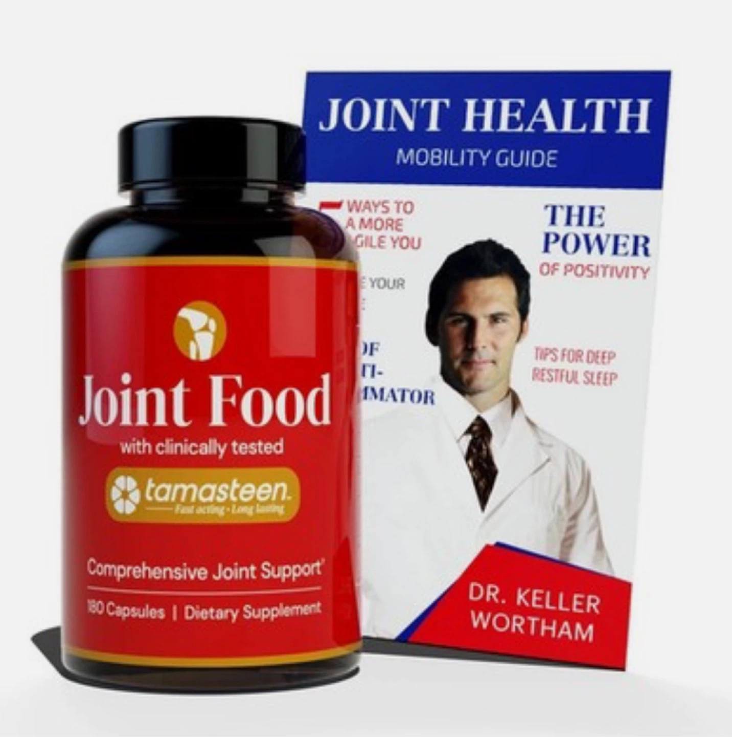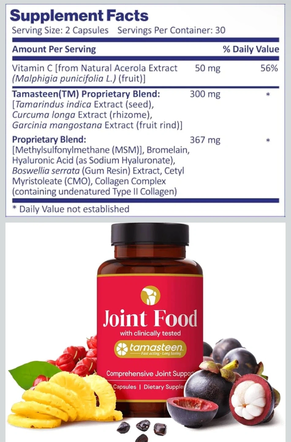 Selling a bottle of Tamasteen Joint Food with 180 capsules. This supplement provides comprehensive joint support with clinically tested ingredients. It contains Vitamin C and a proprietary blend including Tamasteen, Curcuma longa extract, and Garcinia mangostana extract. Also includes MSM, Bromelain, Hyaluronic acid, Boswellia serrata, Cetyl Myristoleate, and Collagen Complex