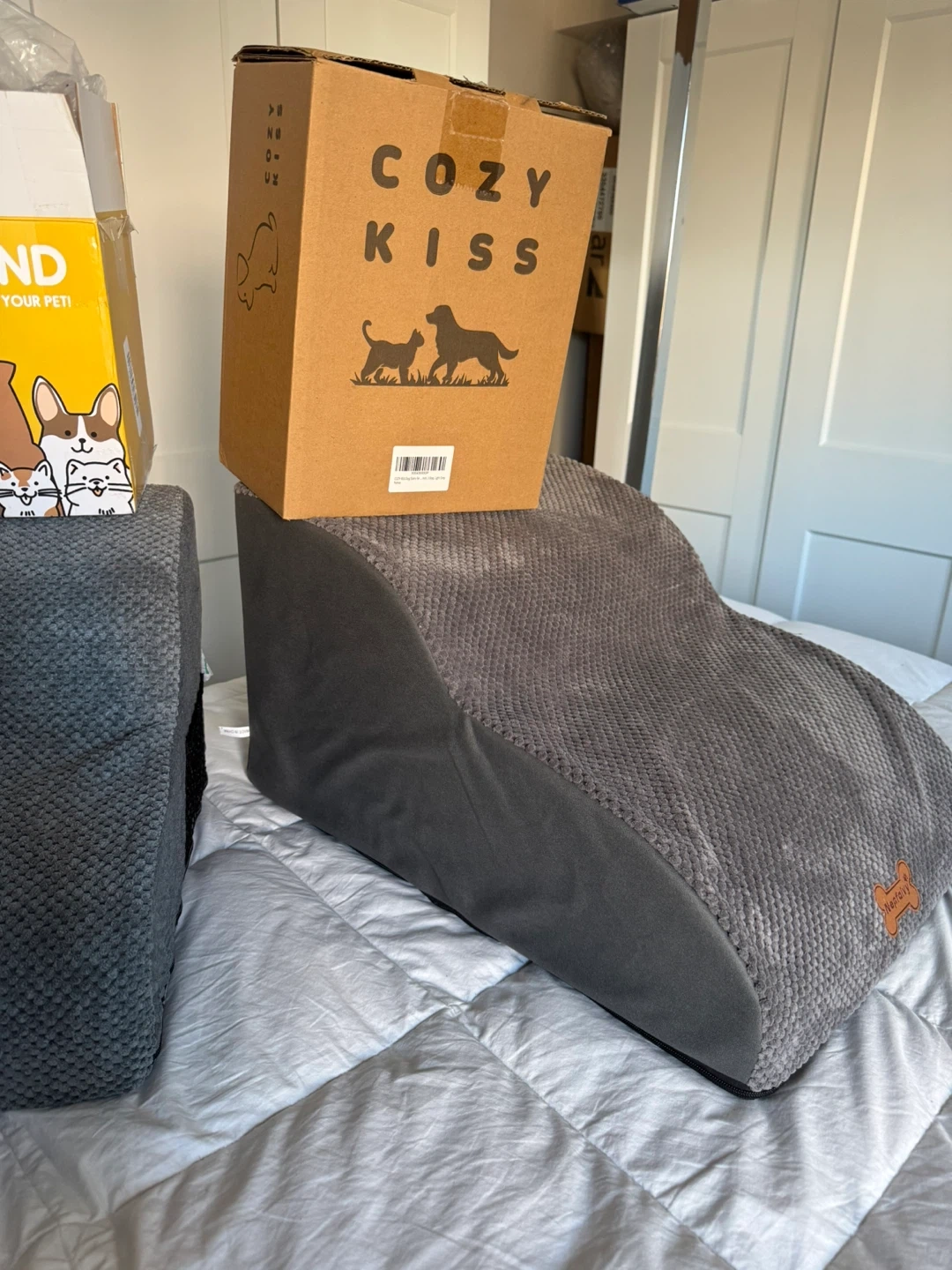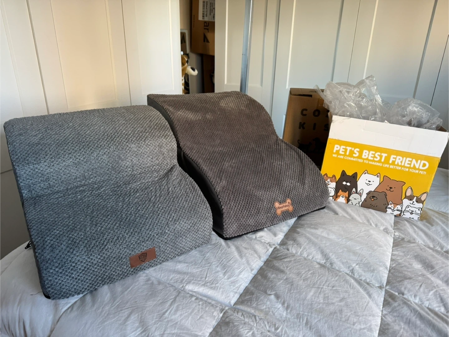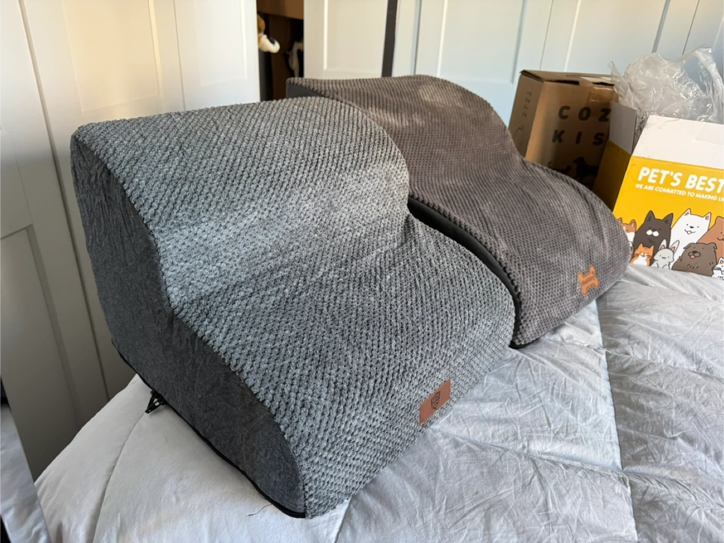 One 12” inch Brand New Dog Steps with Box Still Available $25 SOLD - Short two step 12 inches high by 15 1/2 inches long by 15 1/2 inches wide AVAILABLE - Middle elongated two step 12 inches high 21 1/2 inches long 16 inches wide Both are brand new, freshly taken out of there boxes, just to take the photos, I can bring down the boxes as well $25 each Firm Both are Brand New Pick up in the lobby of my condo located in Scarborough at Finch and McCowan