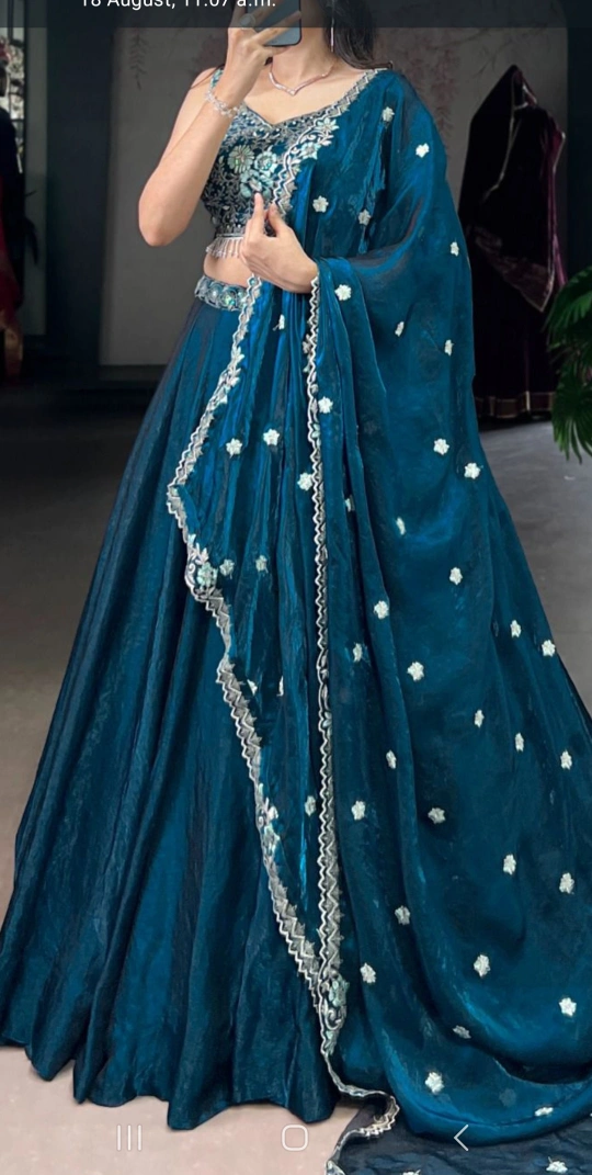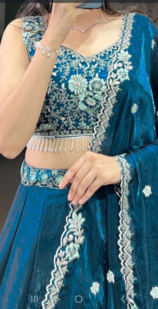 Selling a beautiful teal lehenga choli set. The intricate embroidery and design make it perfect for special occasions. The set includes a skirt (lehenga), a blouse (choli), and a dupatta. It's in great condition and ready for a new home