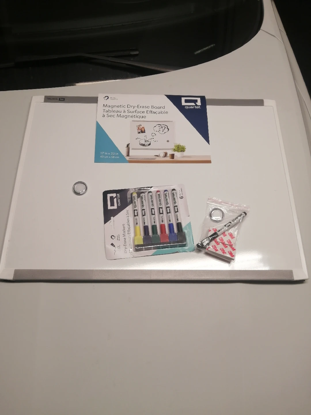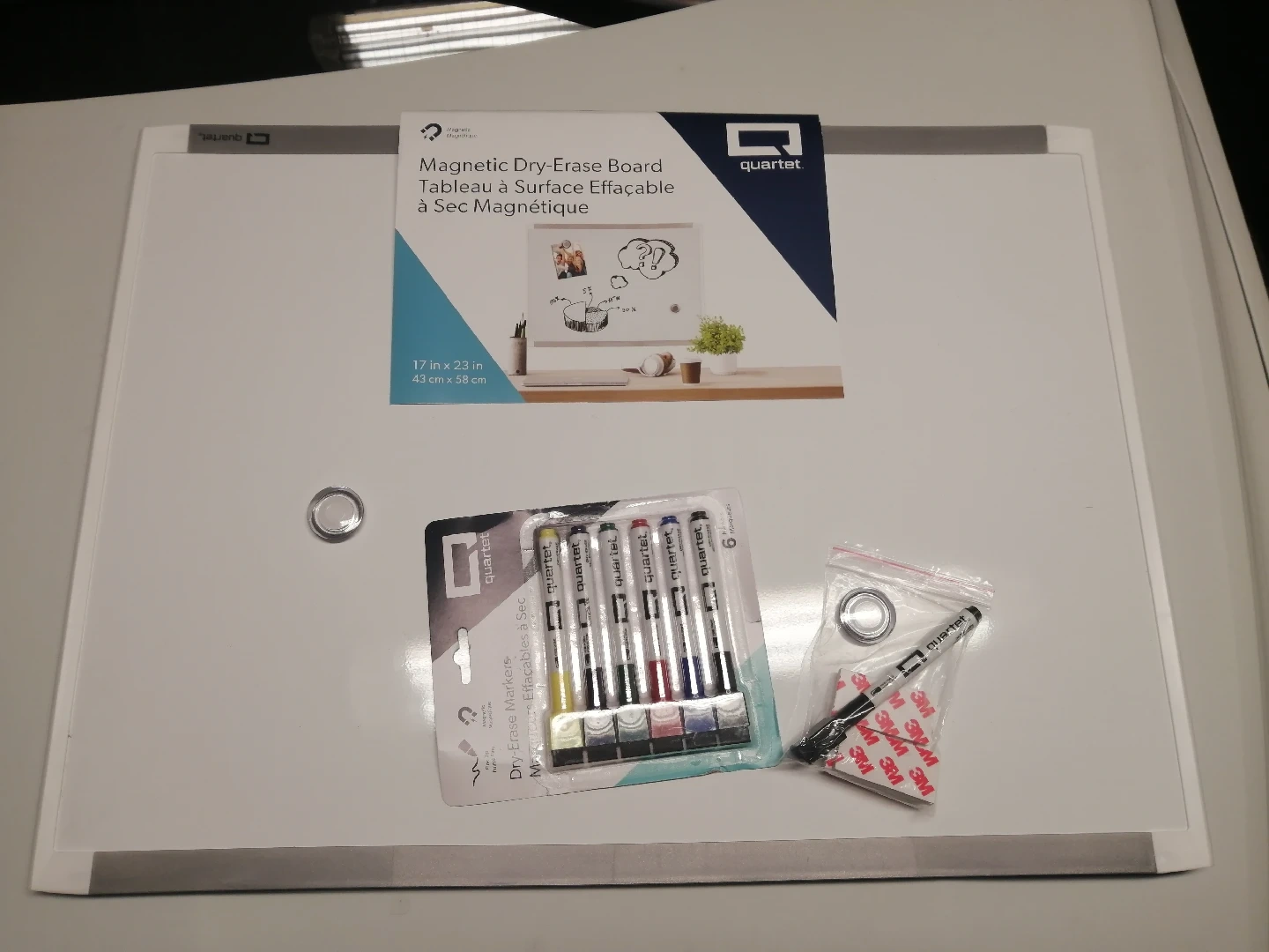 Selling a Quartet magnetic dry-erase board that's in great condition! It measures 17 inches by 23 inches (43 cm x 58 cm). Comes with dry-erase markers and mounting stickers too