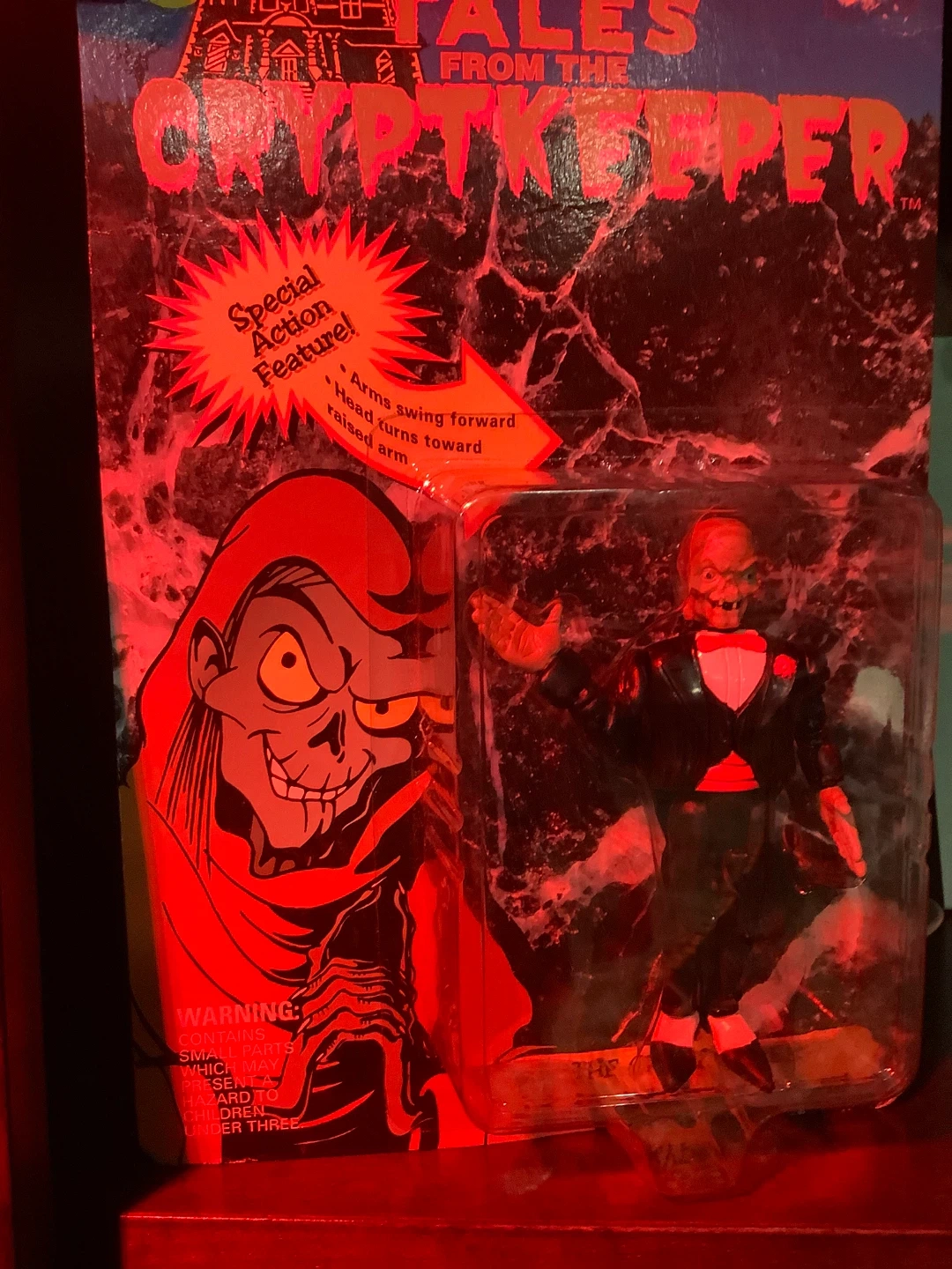 Selling a Tales From The Cryptkeeper action figure! It has a special action feature where the arms swing forward and the head turns toward the raised arm. Warning: contains small parts which may present a hazard to children under three