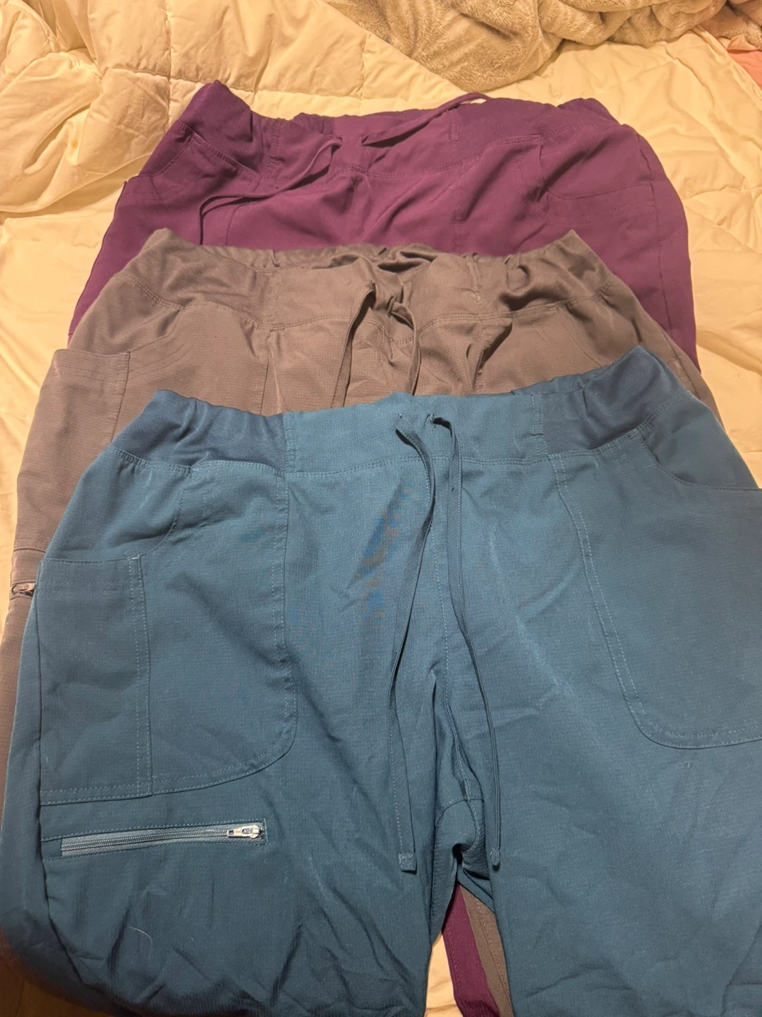Firm on price. Selling three pairs of jogger scrub pants. They're in great condition and ready for a new home! The colours are purple, grey, and teal. Perfect for healthcare professionals or anyone needing comfortable, durable pants.