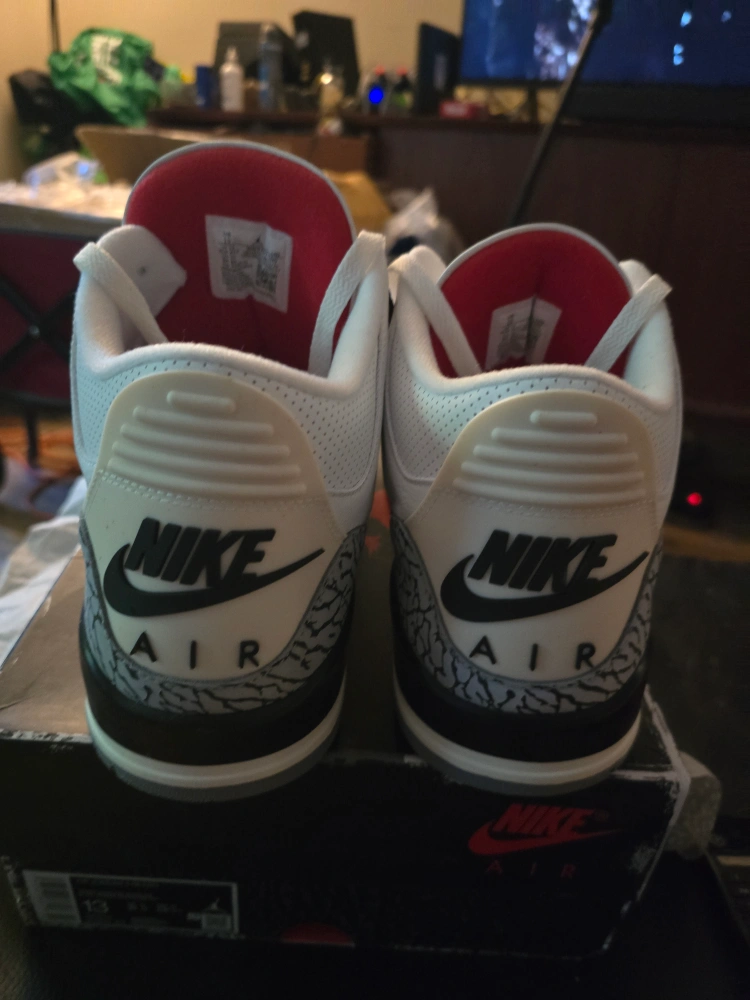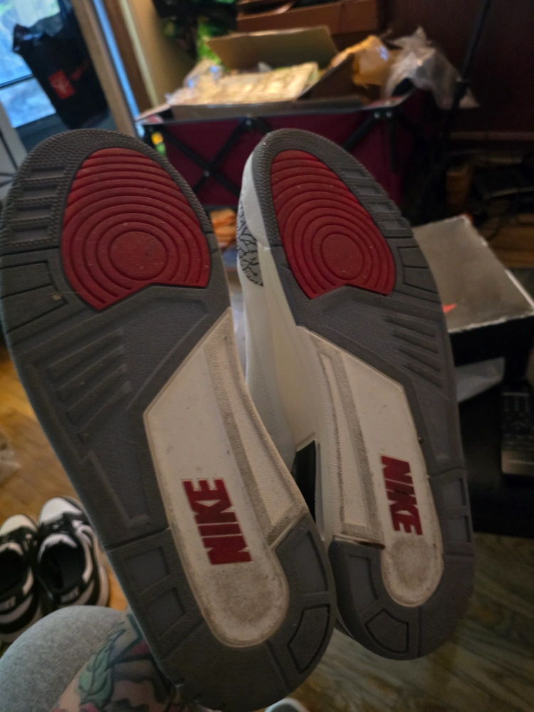 Selling a pair of Nike Air Jordan 3 Retro in the classic White Cement colourway! These shoes feature the iconic elephant print detailing and the Jumpman logo. They've got a bit of wear, as you can see in the pictures, but still have lots of life left. Comes with the original box