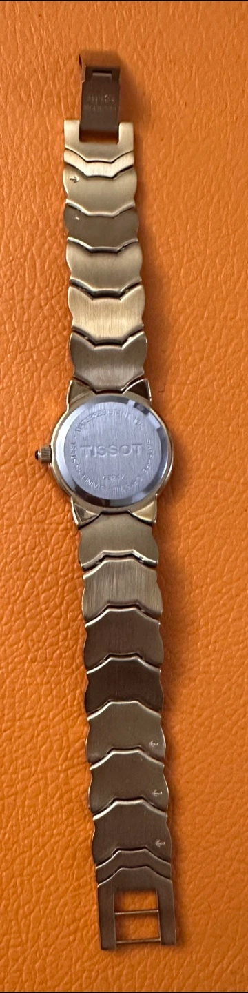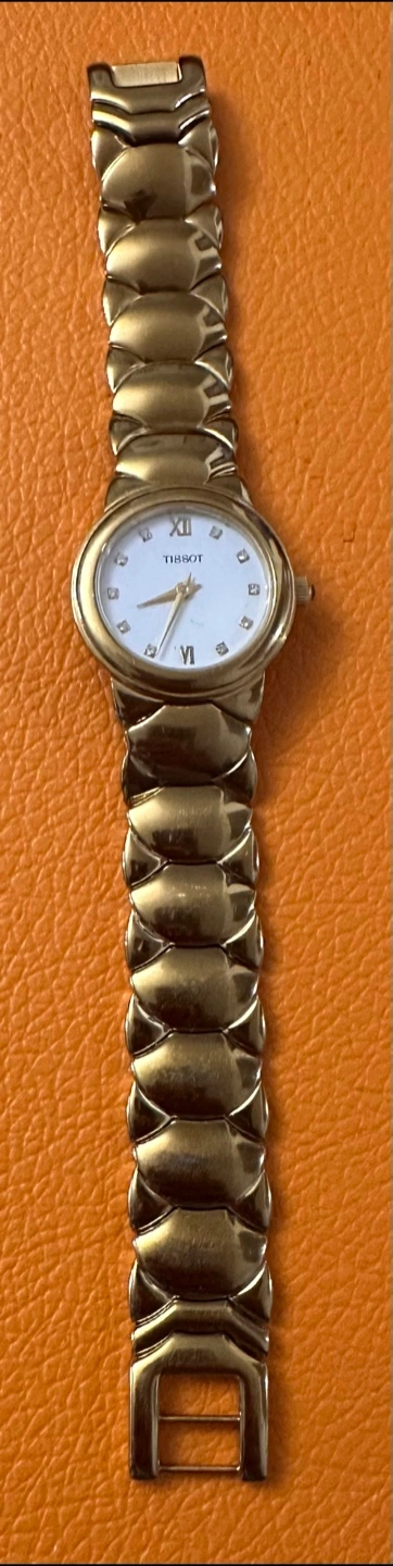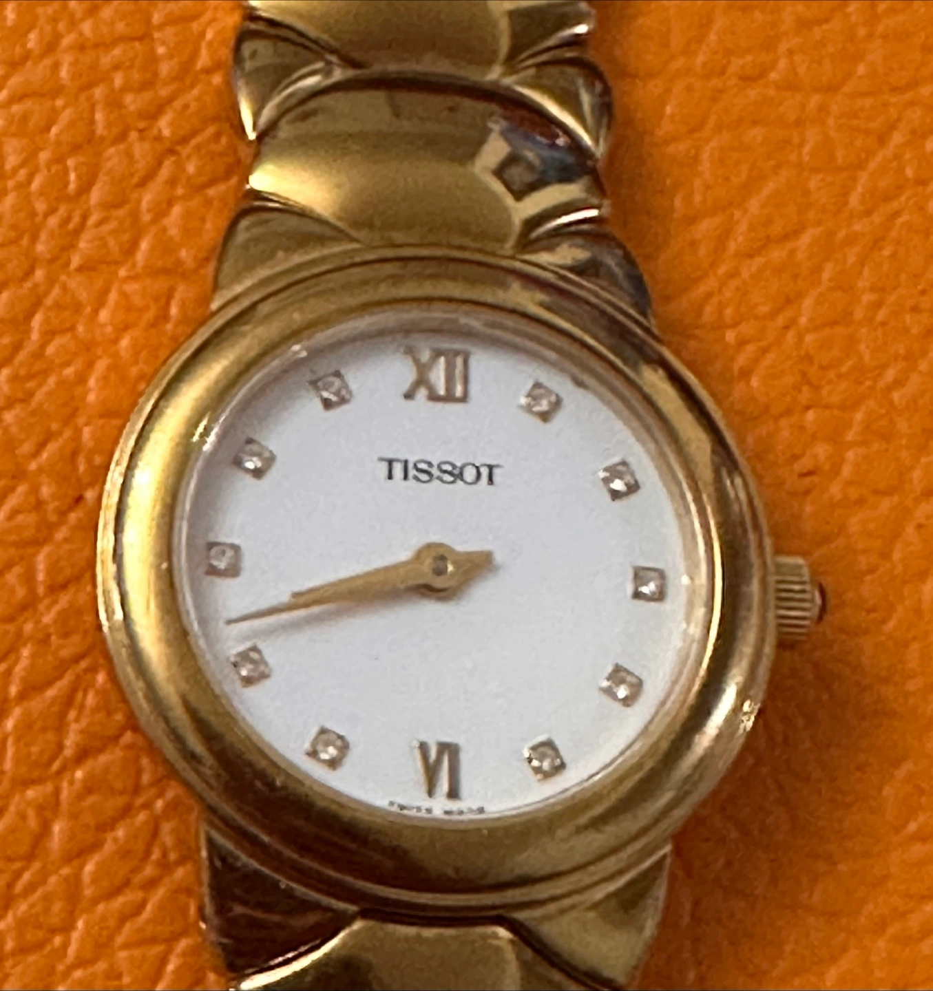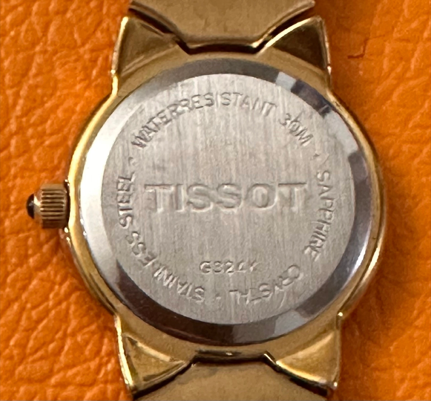 Selling an authentic Tissot G324K women's luxury watch in gold tone stainless steel non tarnish. It features a gold band and a white face with diamond-like accents. The back of the watch indicates it's water resistant to 30m and has a sapphire crystal.