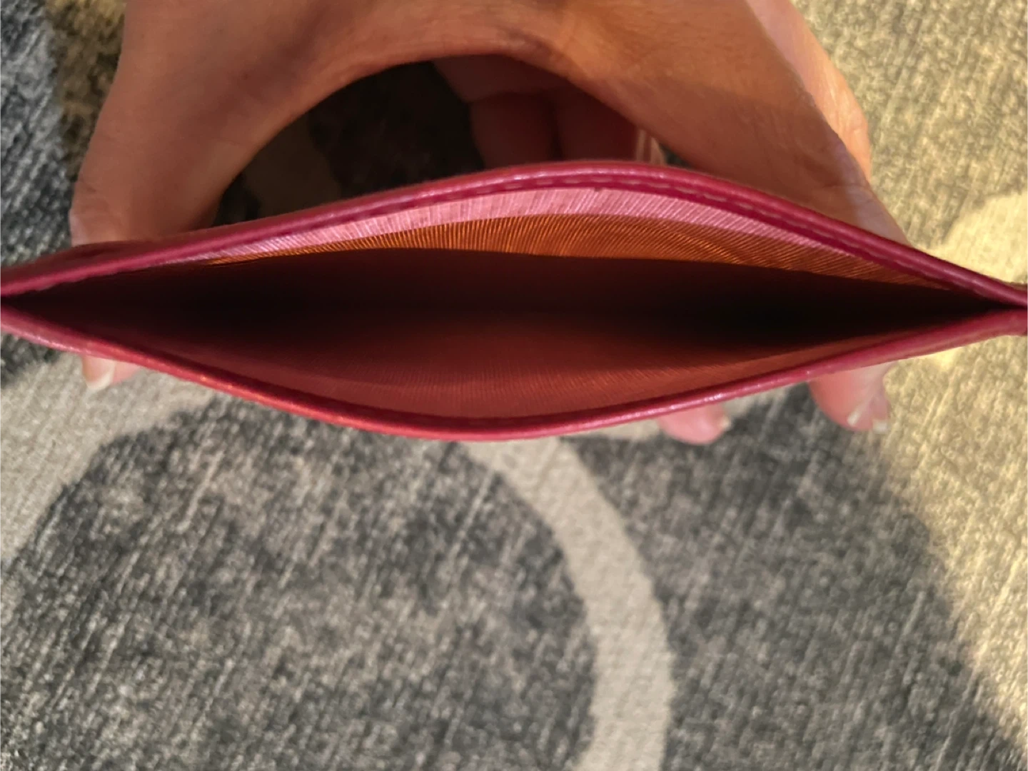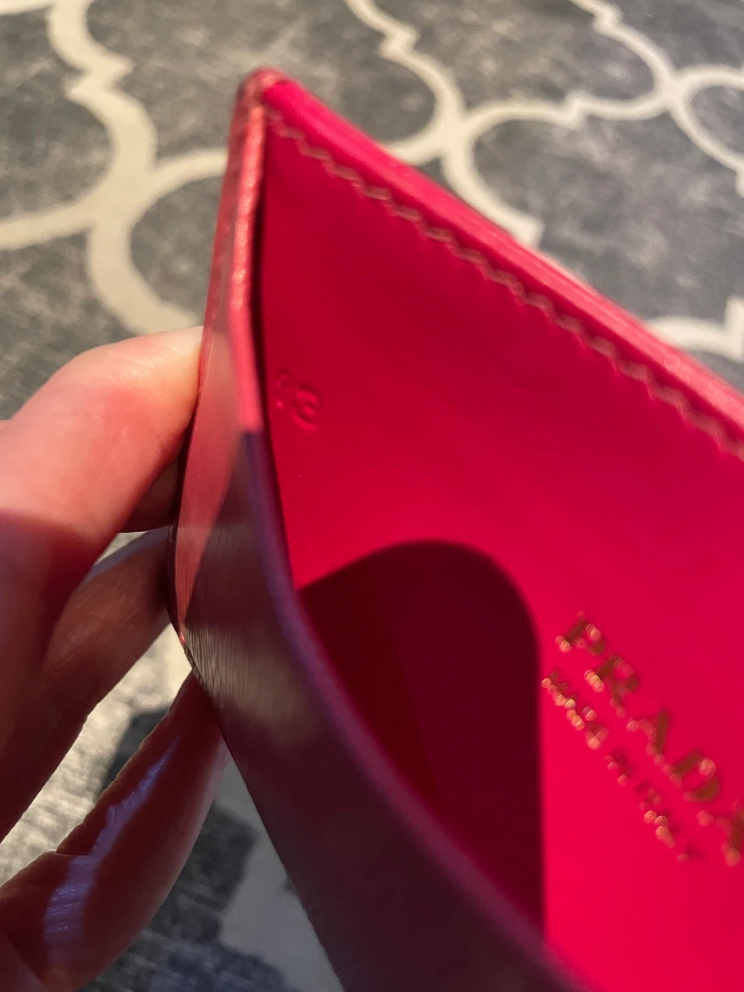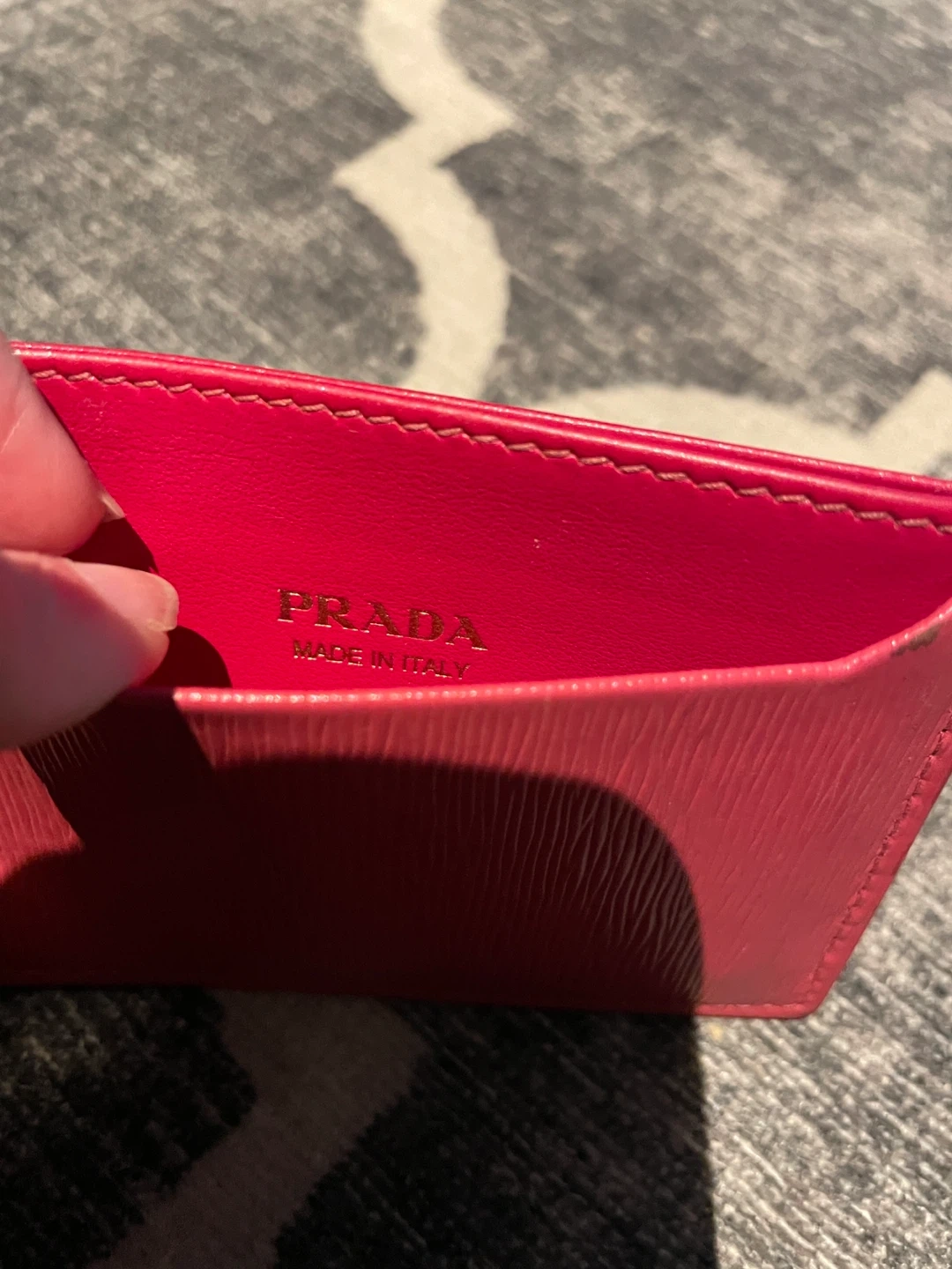 Selling a pink Prada card holder, perfect for carrying your essential cards. The leather has a nice texture and the Prada logo is prominently displayed.
