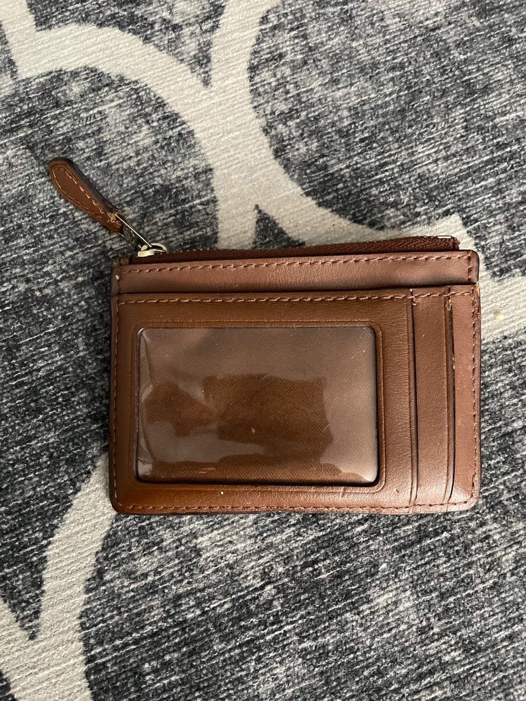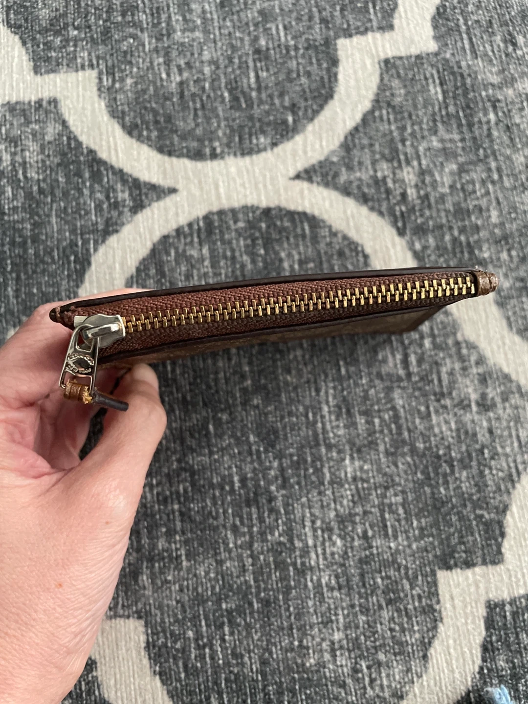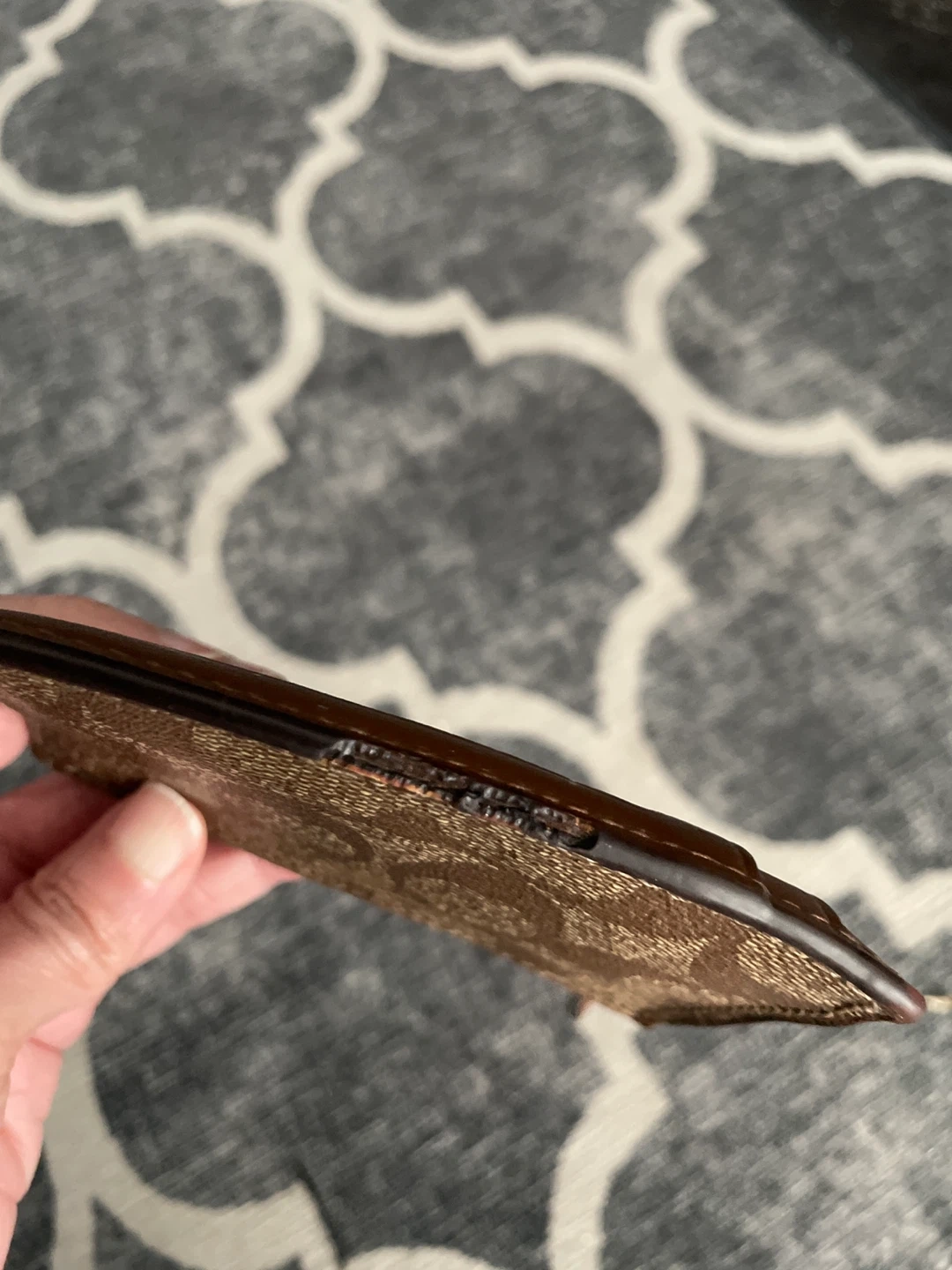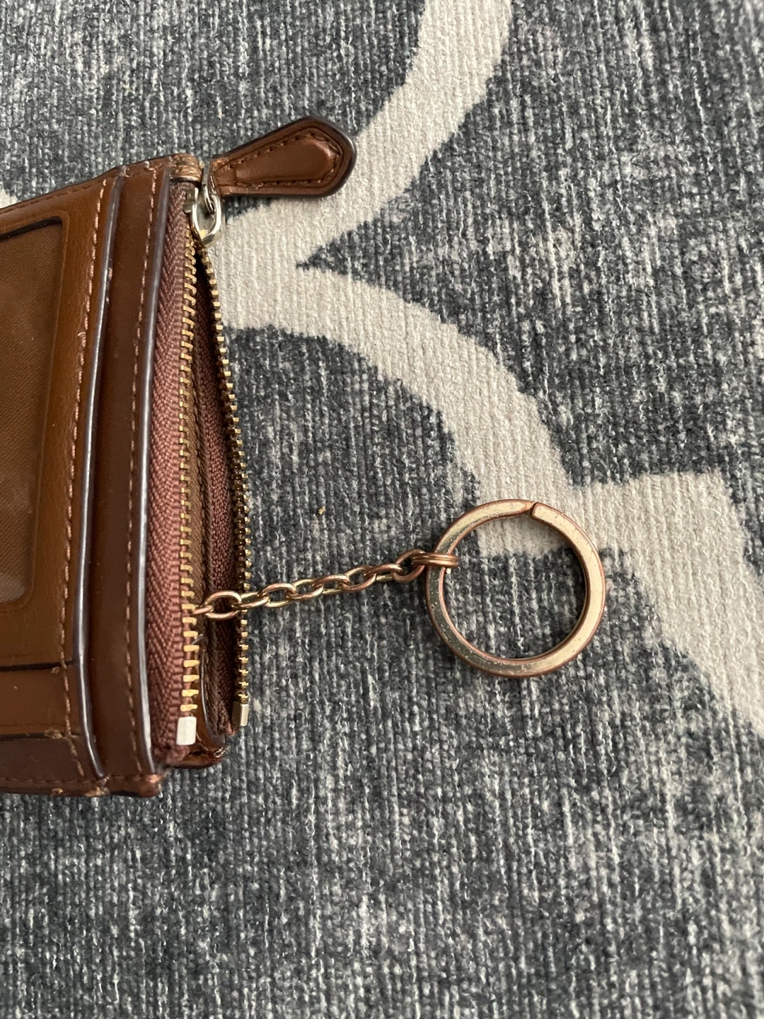 Selling a Coach card holder wallet in brown. It has a zippered compartment and slots for cards. It also has a keychain inside the compartment. Good for everyday use. There is some damage/wear and tear at the bottom of the holder in the middle part. At certain angles it may not be noticeable. Please inspect photos for the condition. Pick up only. Prefer to be paid in cash. Thank you