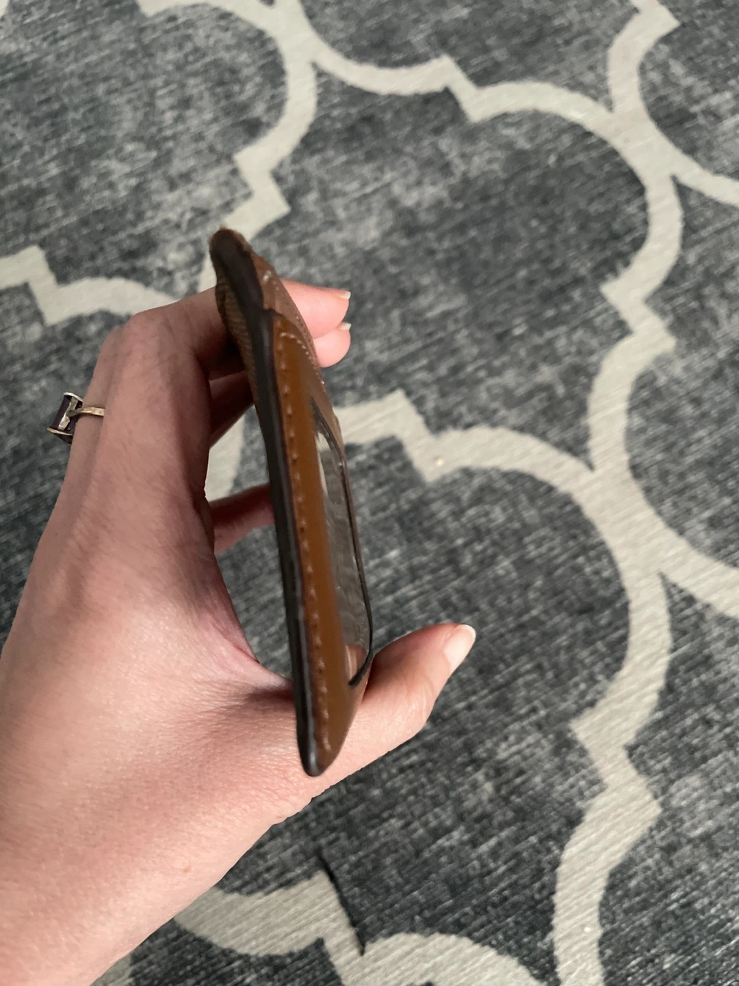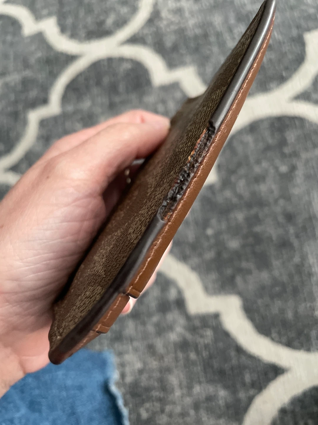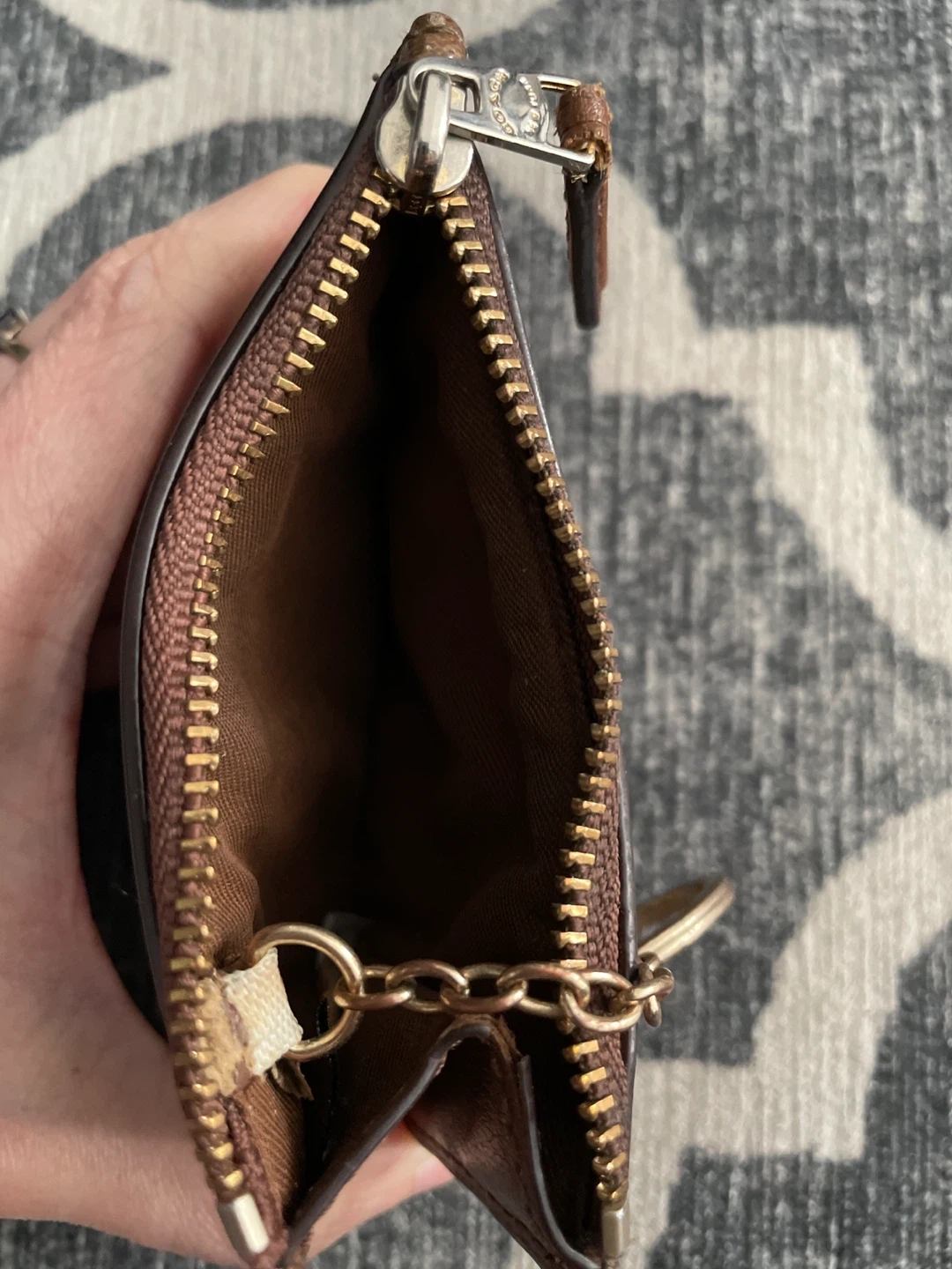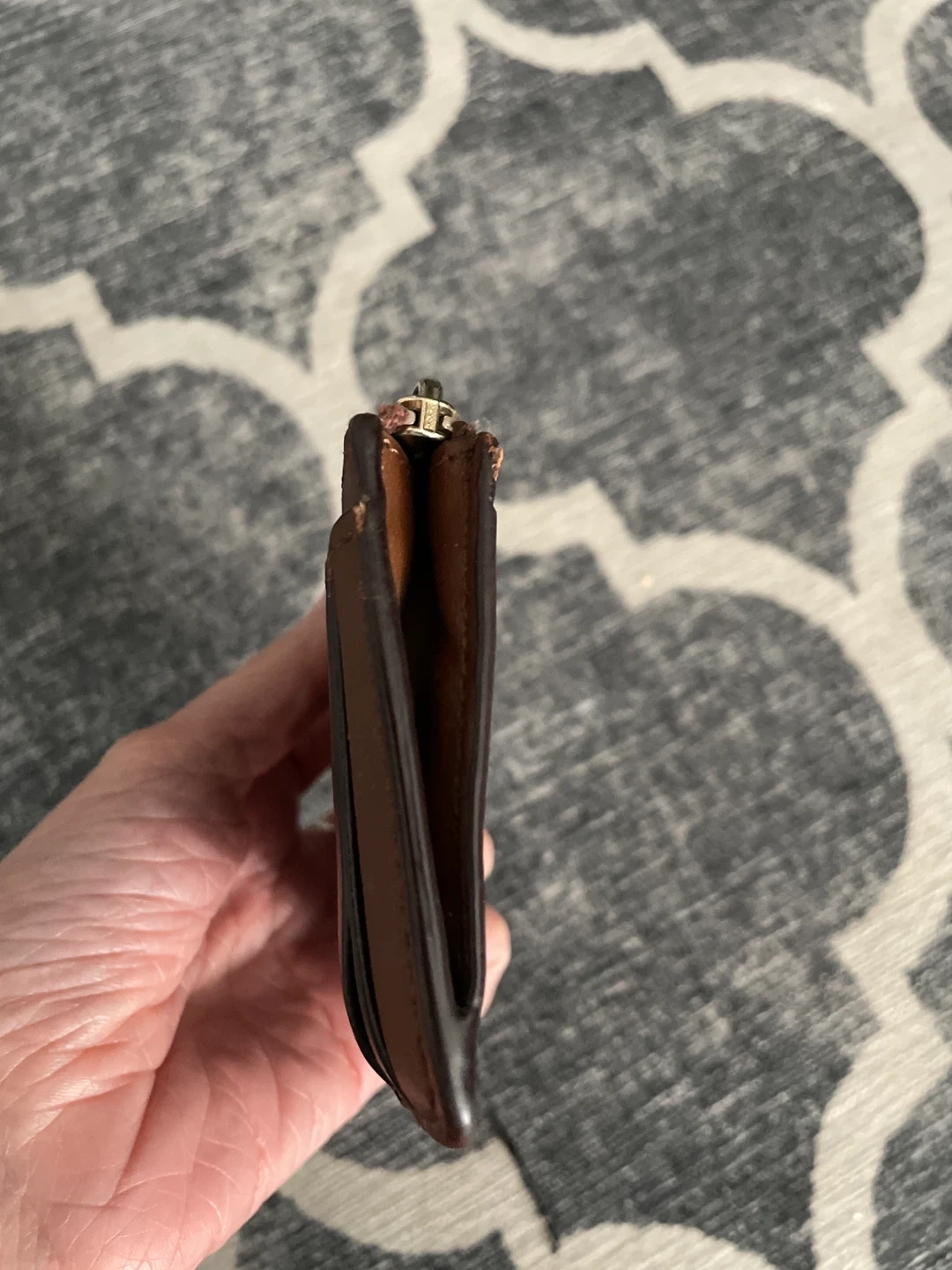 Selling a Coach card holder wallet in brown. It has a zippered compartment and slots for cards. It also has a keychain inside the compartment. Good for everyday use. There is some damage/wear and tear at the bottom of the holder in the middle part. At certain angles it may not be noticeable. Please inspect photos for the condition. Pick up only. Prefer to be paid in cash. Thank you
