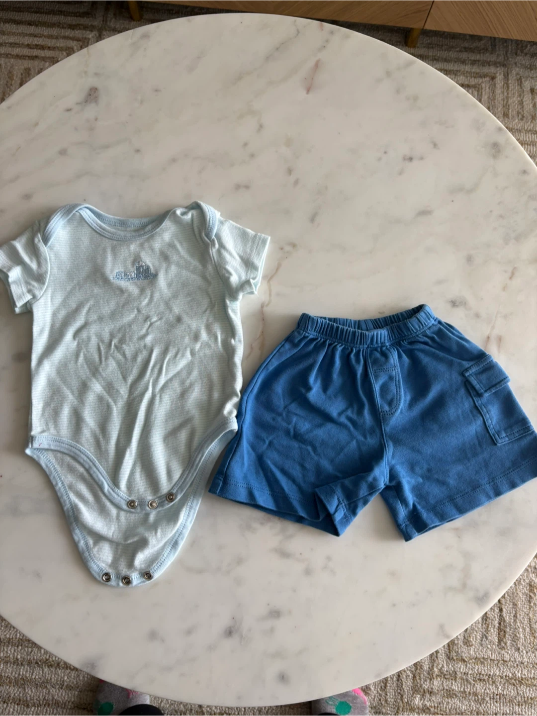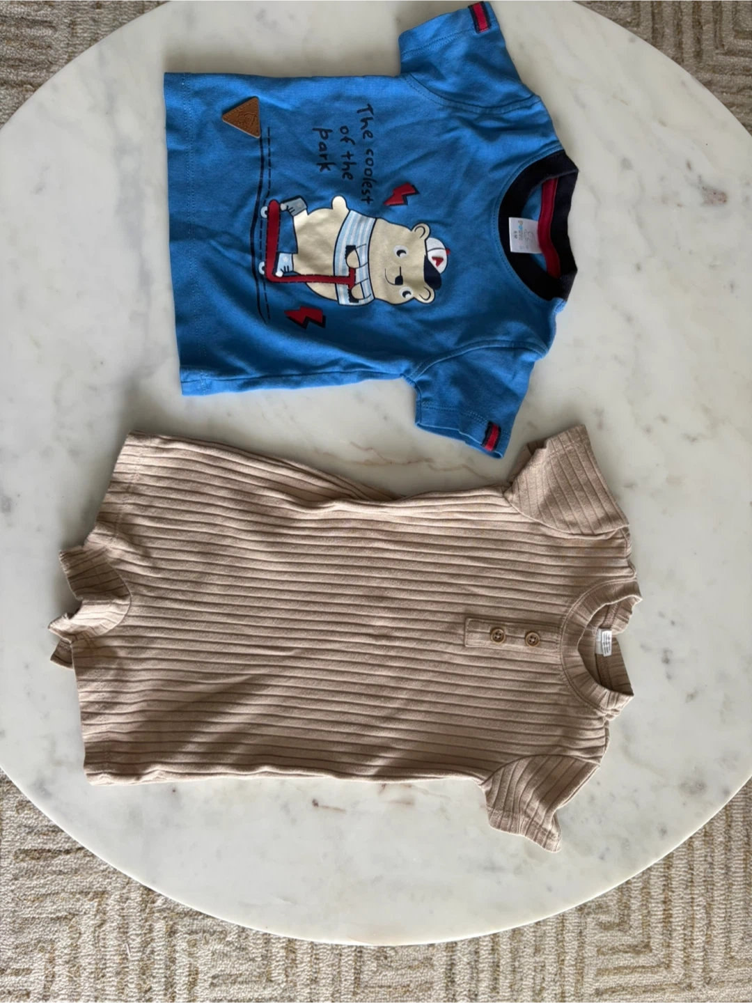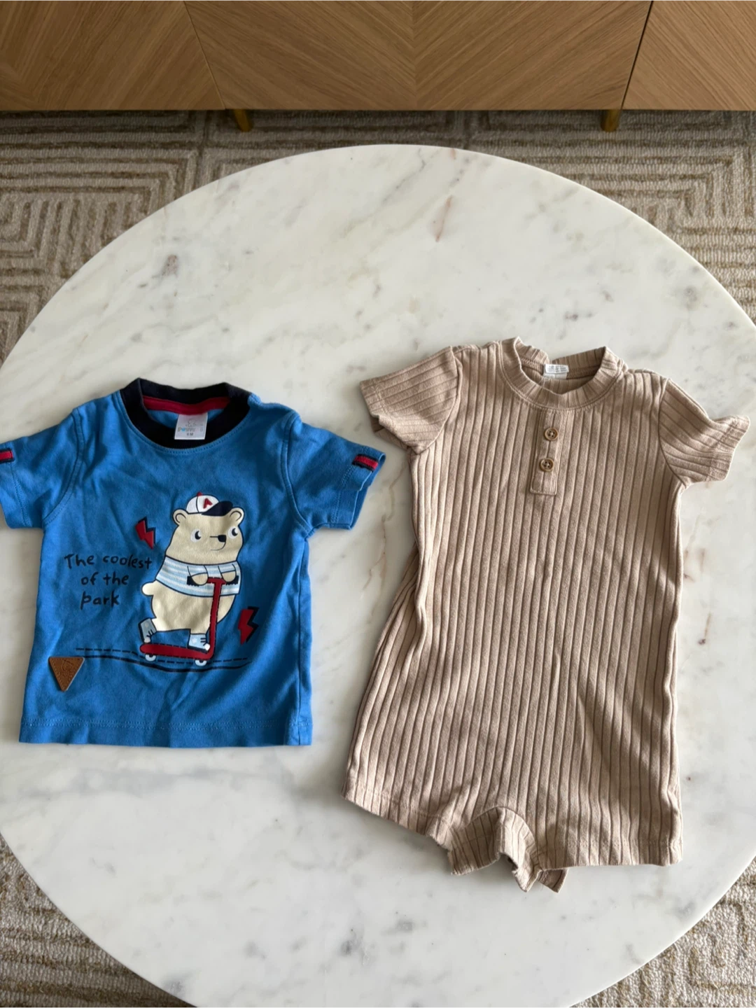 Selling a collection of baby clothes! Includes a variety of onesies, overalls, swim suit and sleepers in different styles and colours. Perfect for a growing baby! Some pieces are 0-6 months and others are 6-9 months