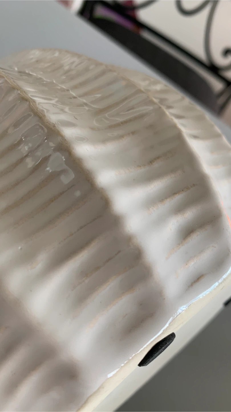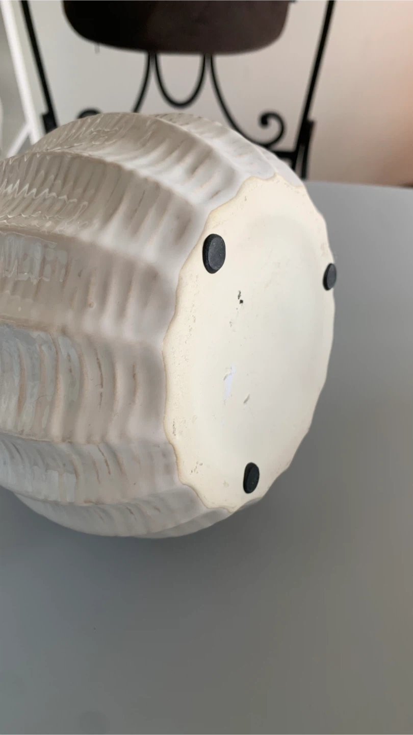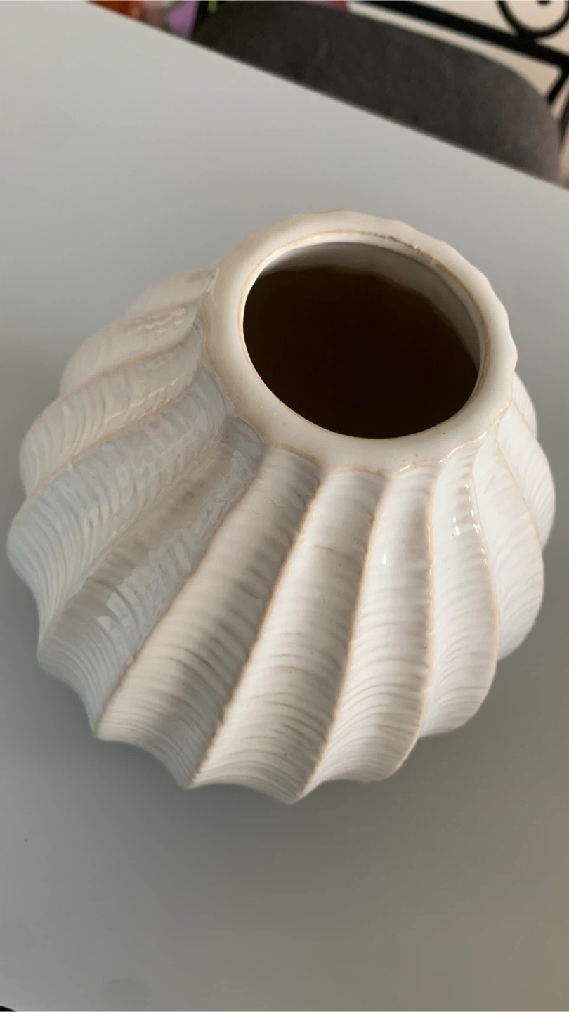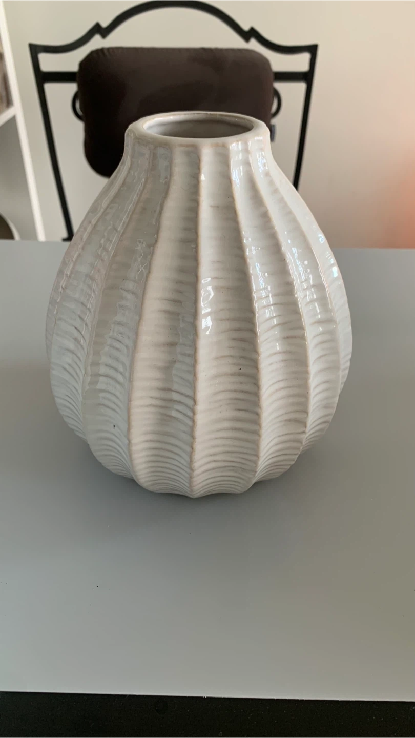 1000+Here's a lovely white ceramic vase with a unique ribbed design! It would be a great addition to any interior and is in great condition.