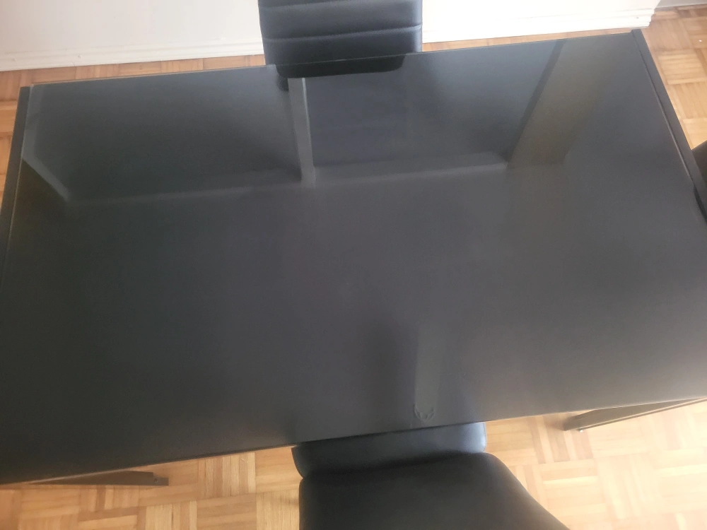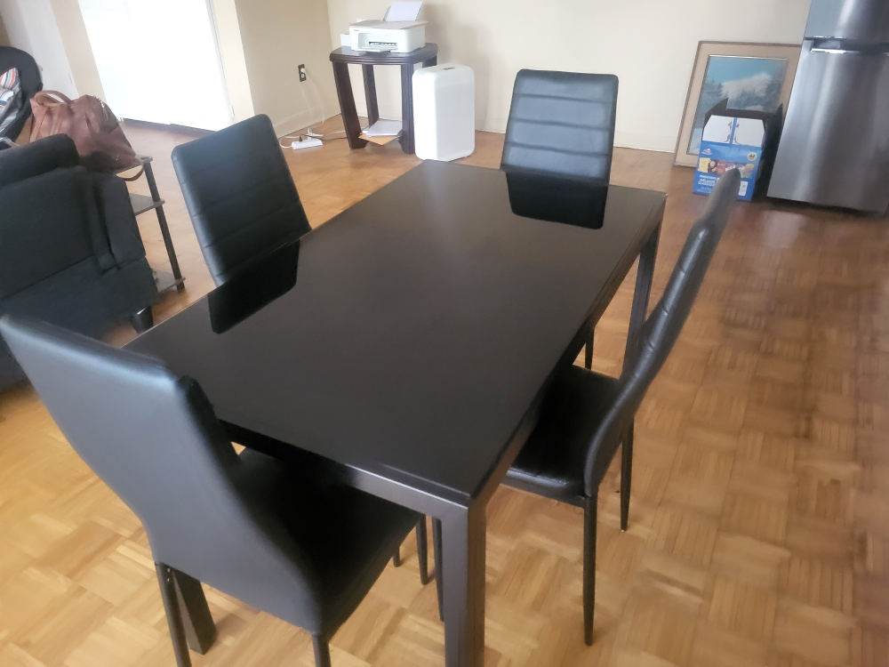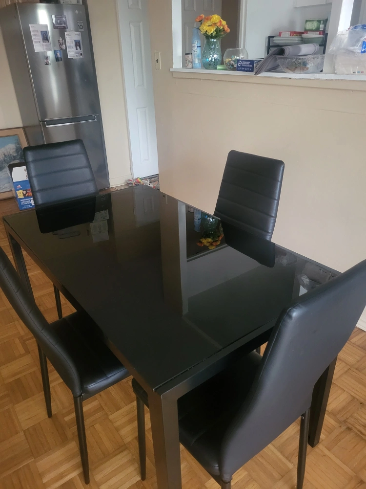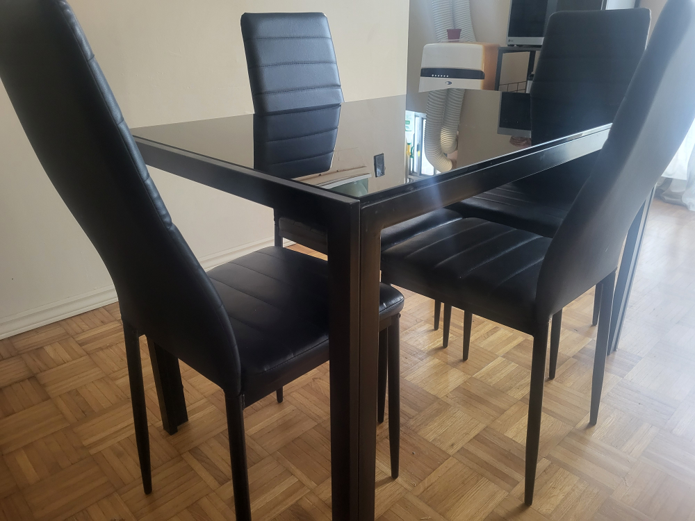 Selling a dining table with four chairs! The set has a sleek, modern look with a black finish. Perfect for a small dining area or kitchen. There is a small chip on the table top.