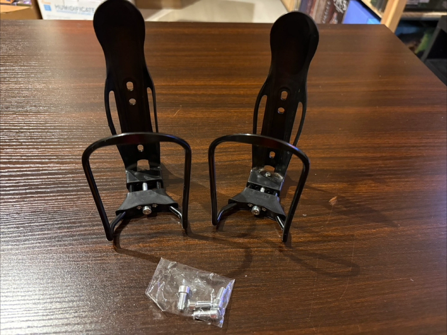 Selling a pair of bike water bottle cages. They are adjustable to fit different sizes of containers. Only one was used and it was only used briefly. Includes mounting hardware.