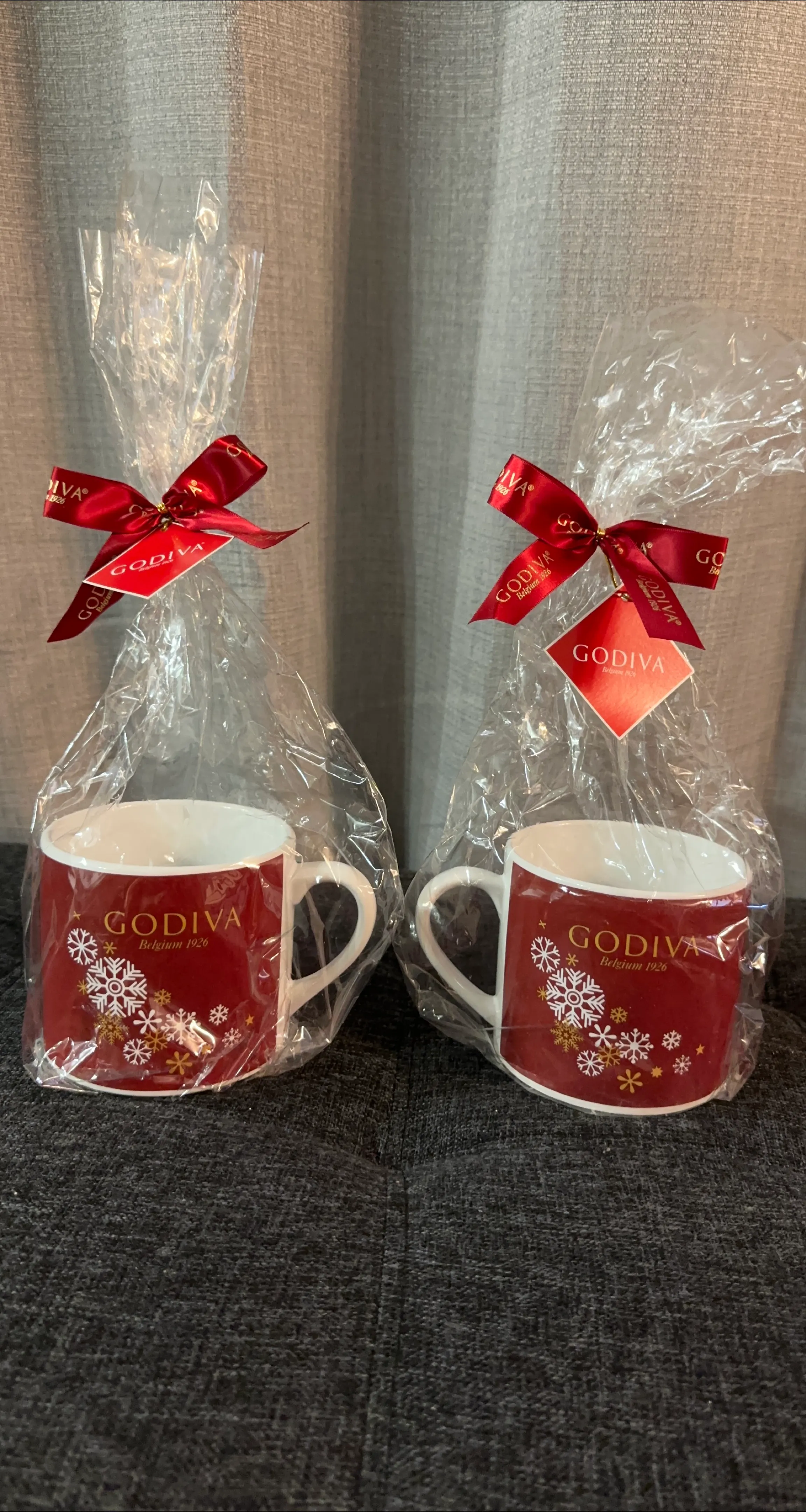 I have two Godiva Holiday mugs, still sealed in their original packaging! They're red with a festive snowflake design and would be perfect for enjoying a cozy drink this winter.