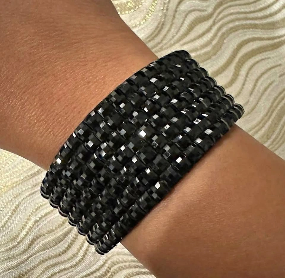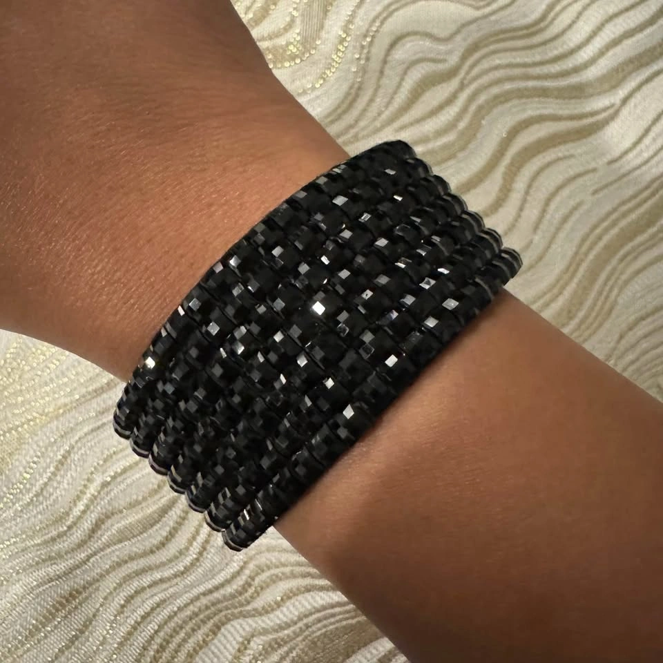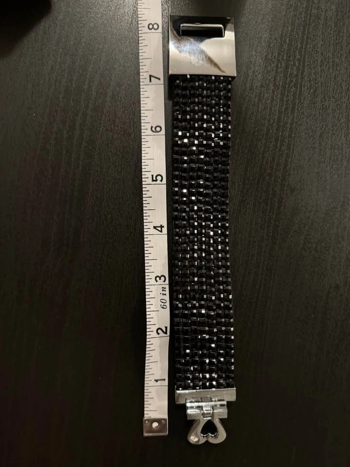 Sparkly black bracelet in lovely, like new condition. Silver tone metal, stainless steel heart buckle clasp. Beautiful statement piece for a night out! 🖤✨ Let me know if you have any questions or require more photos/videos. All photos/video were taken in indoor warm light.