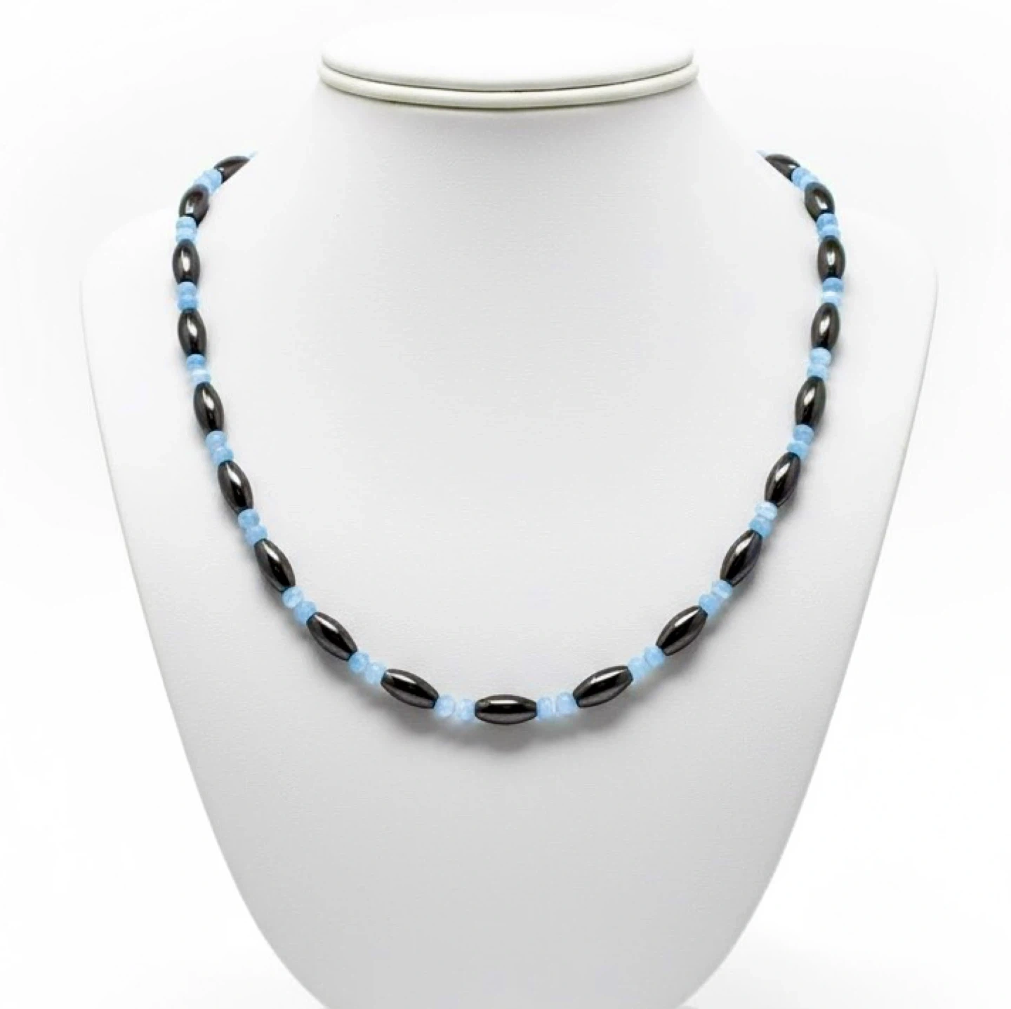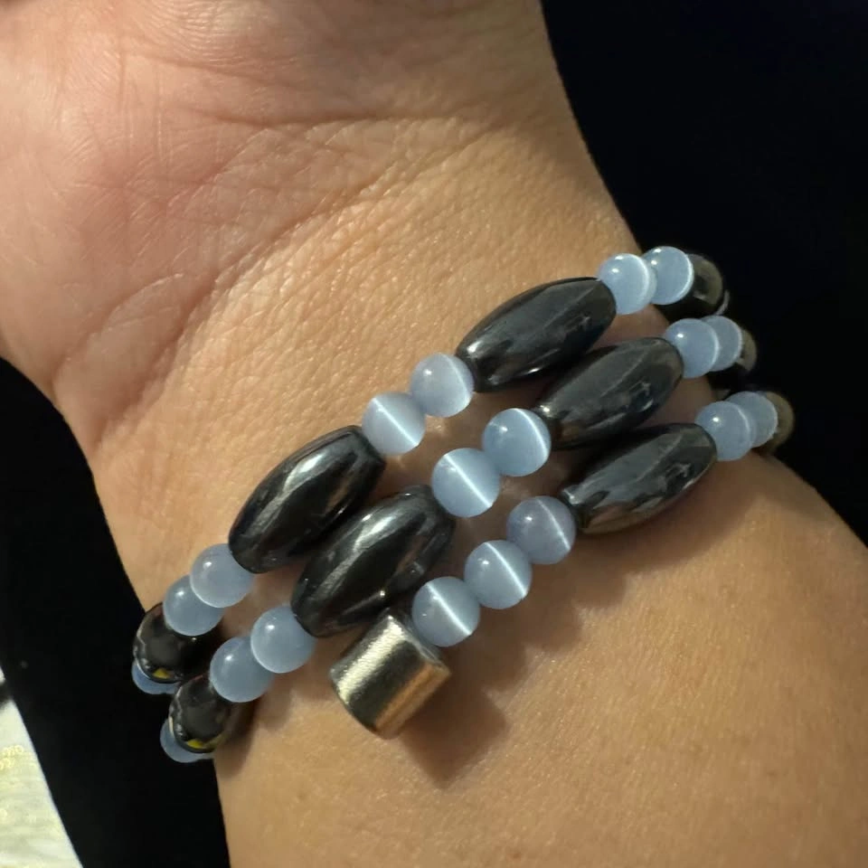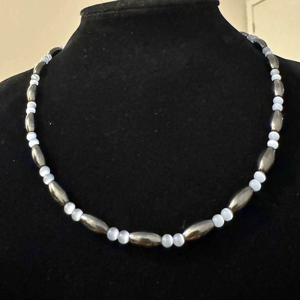 The item is in good vintage condition. Beautiful hematite magnetic necklace with pale blue cat’s eye gemstone beads and magnetic clasp. Can also be worn as a wrap bracelet around your wrist due to the magnetic nature of the necklace (refer photos).