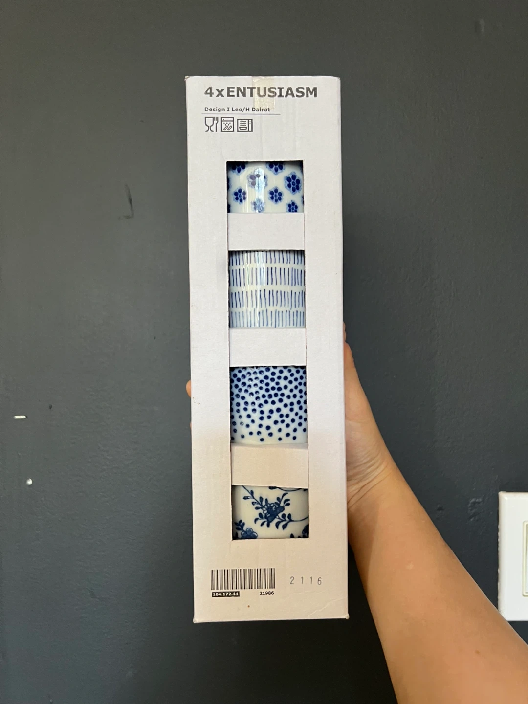 Set of 4 IKEA ENTUSIASM teacups, brand new in box. All have different blue patterns on a white cup base. See last photo for slight damage on box in case you wanted to gift (but can still be wrapped without box!)