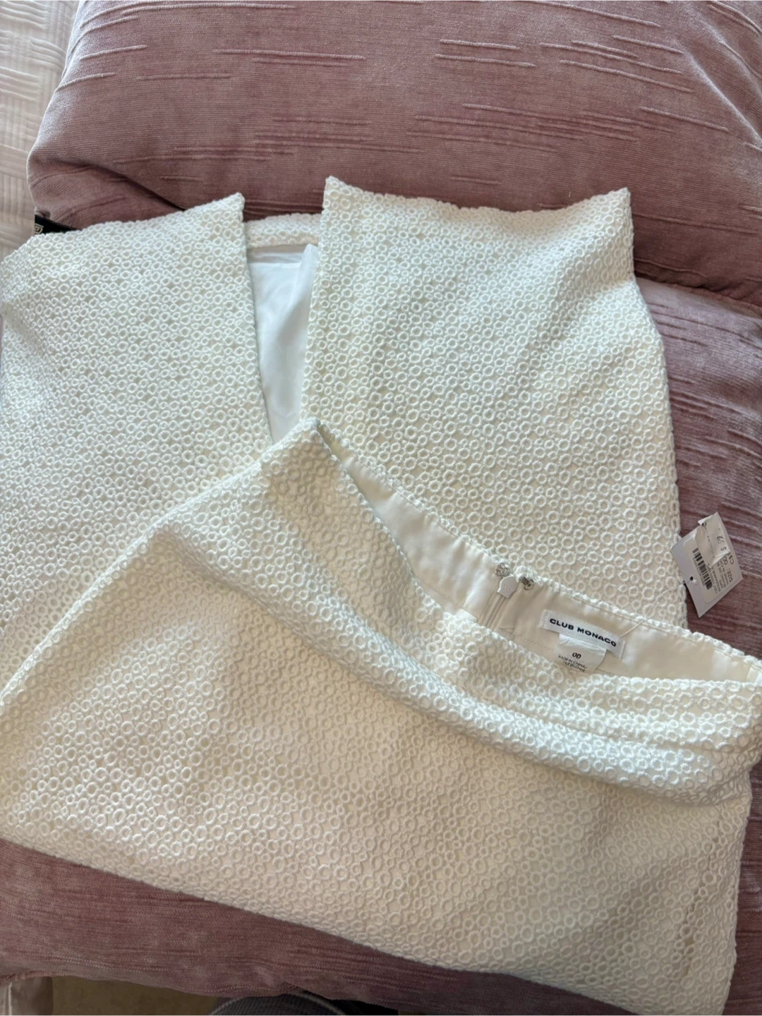 Selling a brand new cute Club Monaco skirt in size 00! It's a lovely white colour. Perfect for dressing up or down.