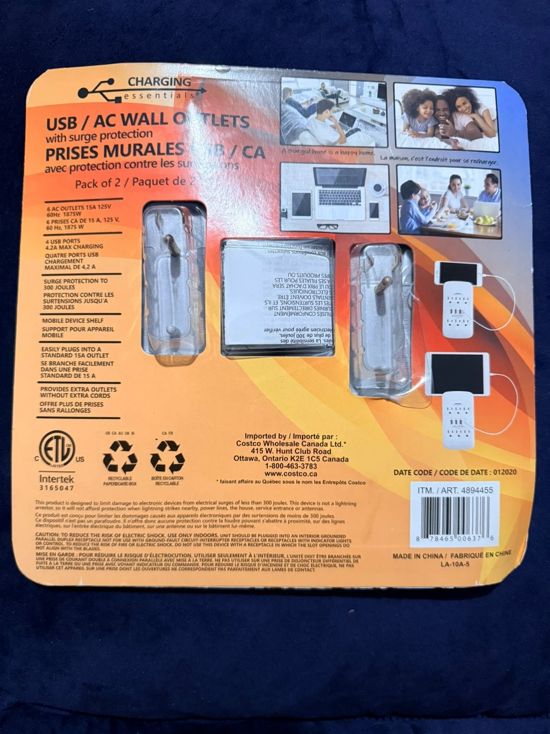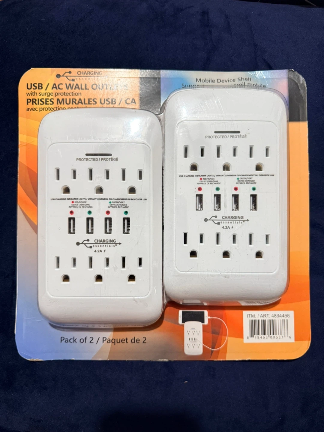 Selling a pack of two Charging Essentials USB/AC wall outlets with surge protection. Haven’t open from the packaging itself! They feature 4 USB ports (4.2A total) and 6 AC outlets (15A, 125V). These outlets also have surge protection and provide extra outlets.