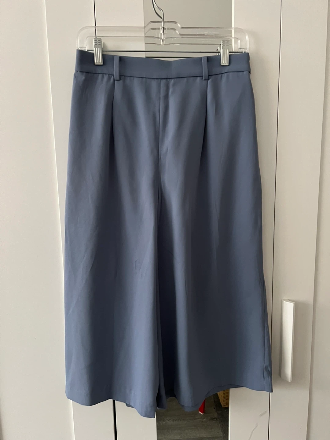 Wide leg Uniqlo pants in light greyish blue. Size M or 28-29 in waist and has a side zipper. Thick but flowy material.