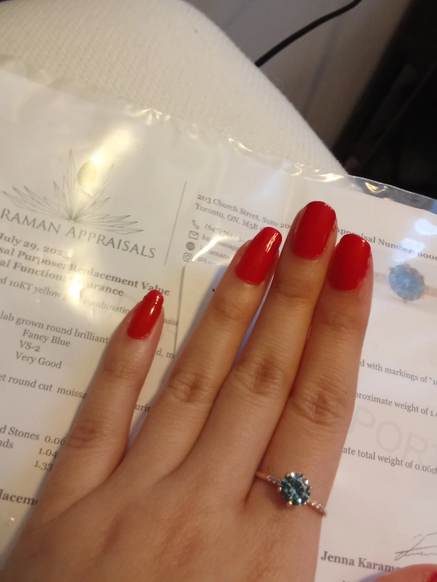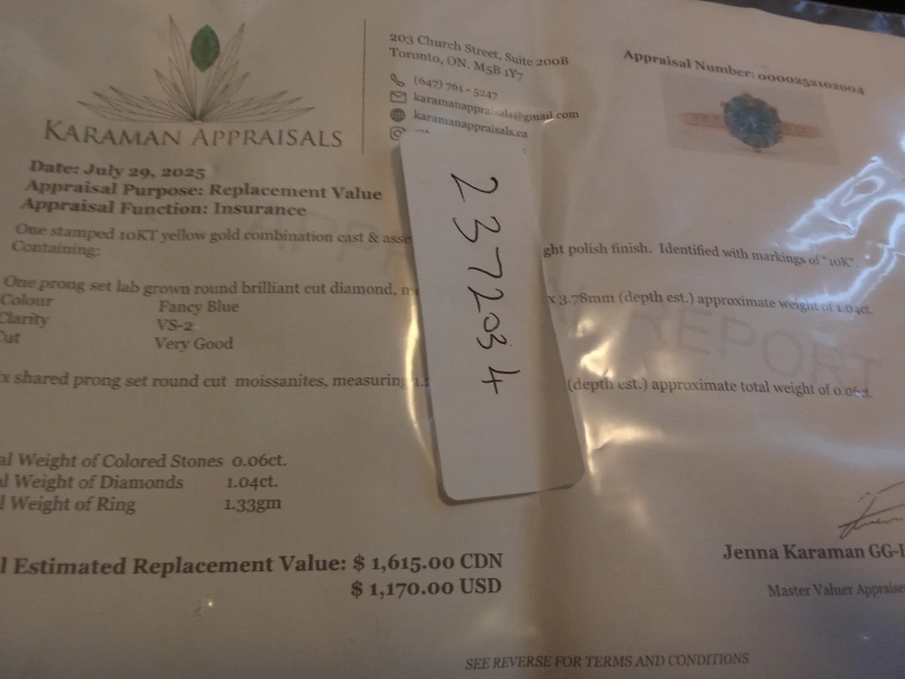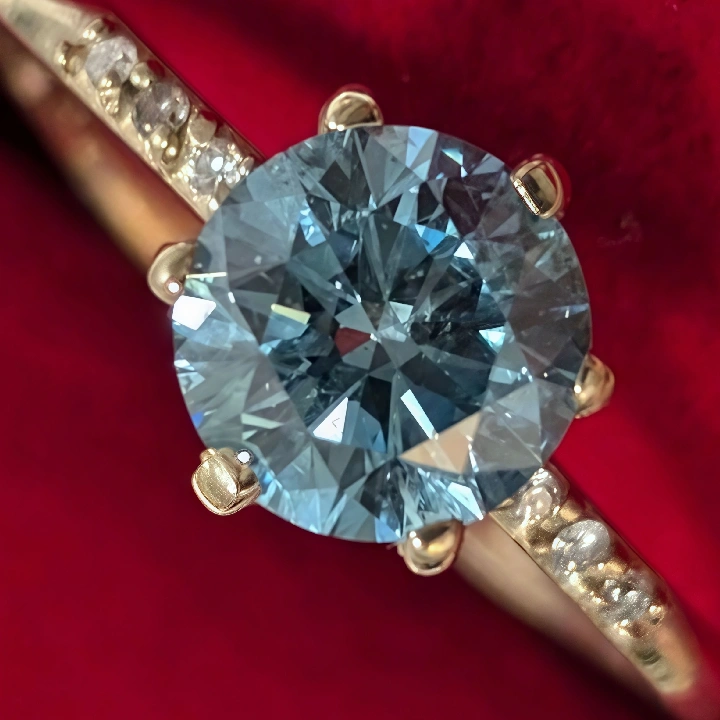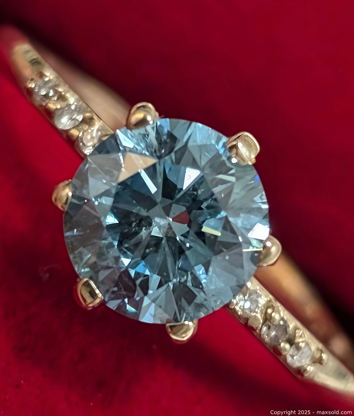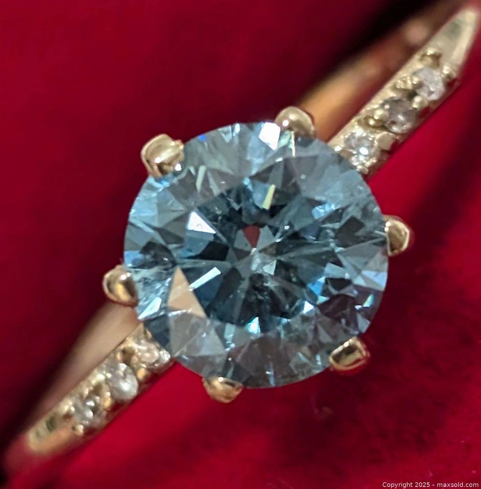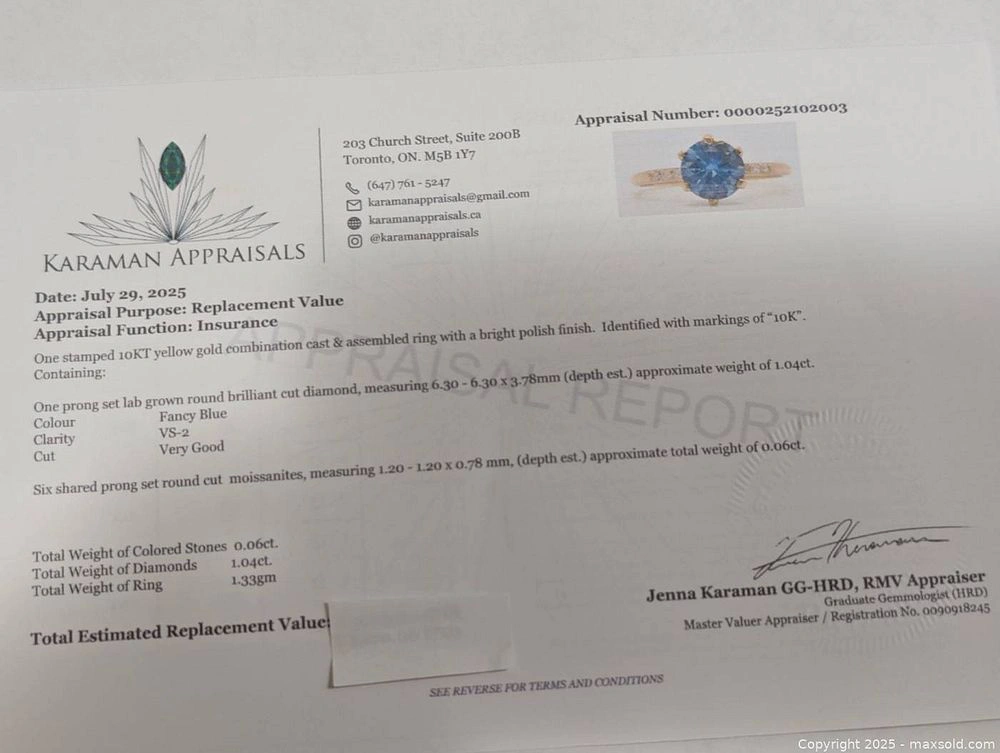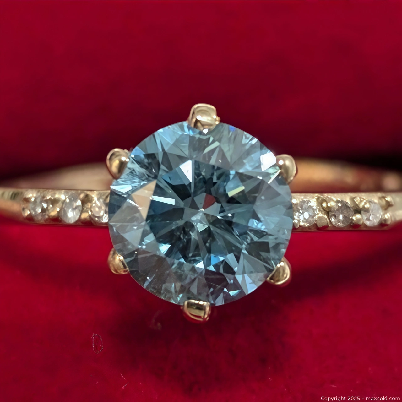 1.04ct Fancy blue color , round brilliant cut lab grown diamond The ring is stamped 10kt yellow gold combination cast and assembled with a bright polish finish. Details: - Size: 6.5 - Colour: Fancy Blue - Clarity: VS-2 Very Good - Diamond: 6.30 - 6.33 x 3.78mm (depth est.) approximate weight of 1.04ct - Small diamonds: measuring 1.20 - 1.20 x 0.78 mm, (depth est.) approximate total weight of 0.06ct. - Total Weight of diamonds: 1.0ct - Total Weight of Ring: 1.33gm