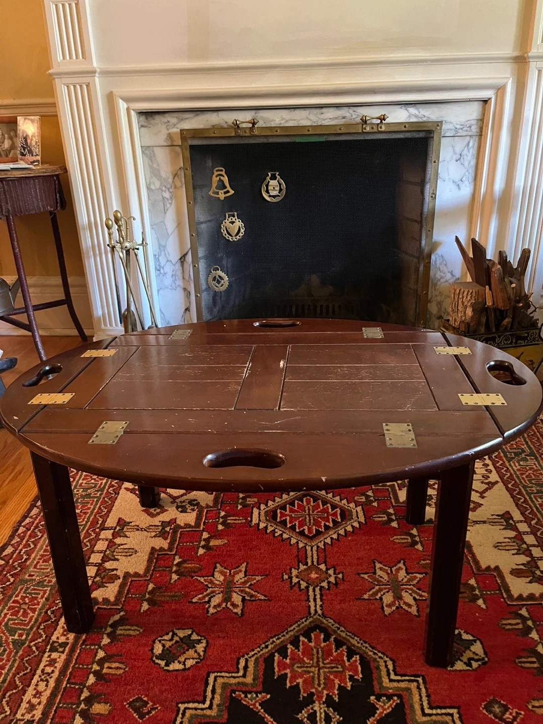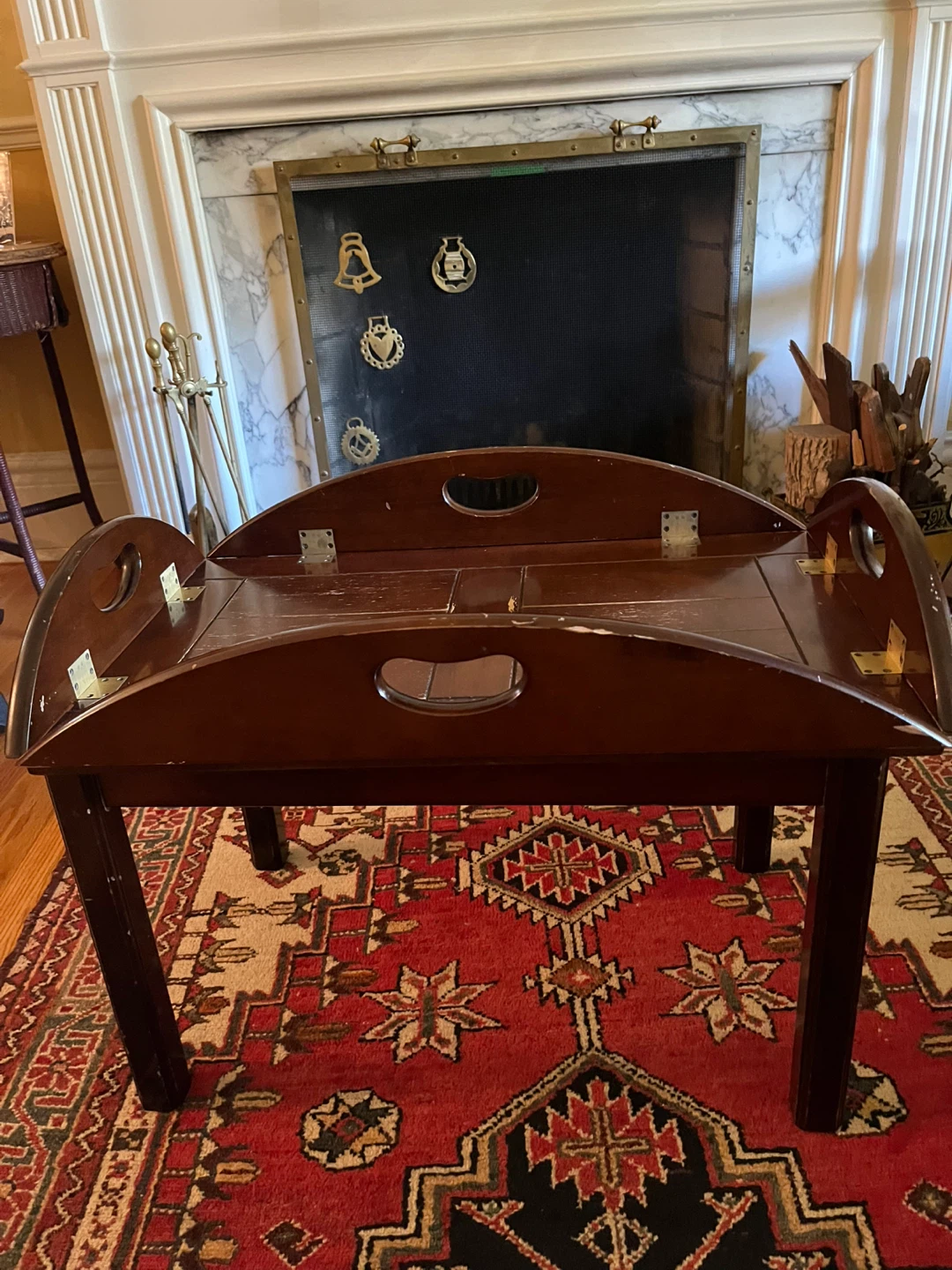 This classic butler table made by the Bombay Company has a removable top that can be used as a tray for serving tea etc.