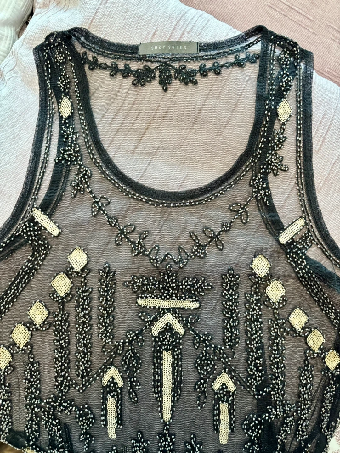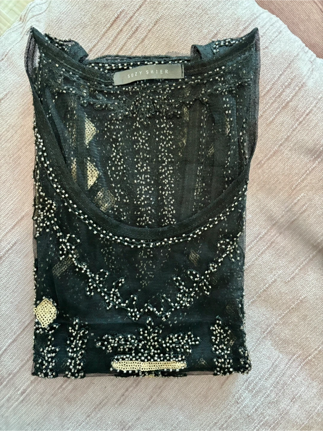 Selling a beautiful black beaded tank top from Suzy Shier! It's a size small and features intricate beadwork. The material is lightweight and perfect for layering or wearing on its own. It's in great condition and ready for a new home