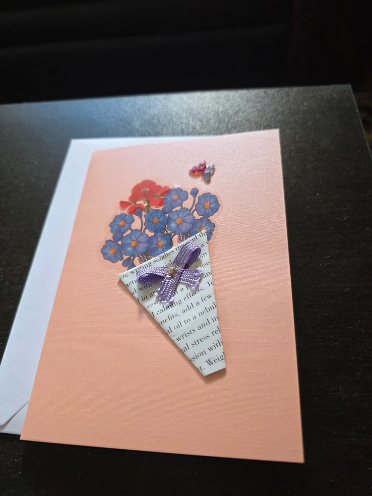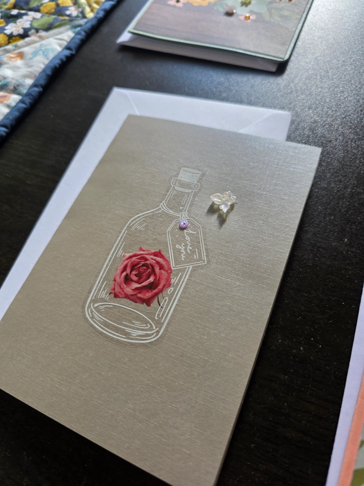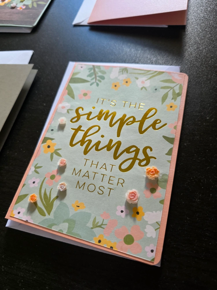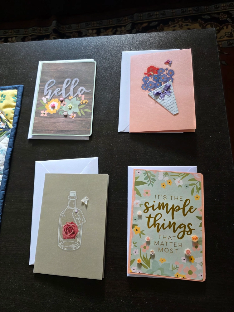 Selling a set of four handmade greeting cards. Each card features unique designs and embellishments, perfect for any occasion! They're blank inside, ready for your personal message. Each card comes with an envelope. Price for all.