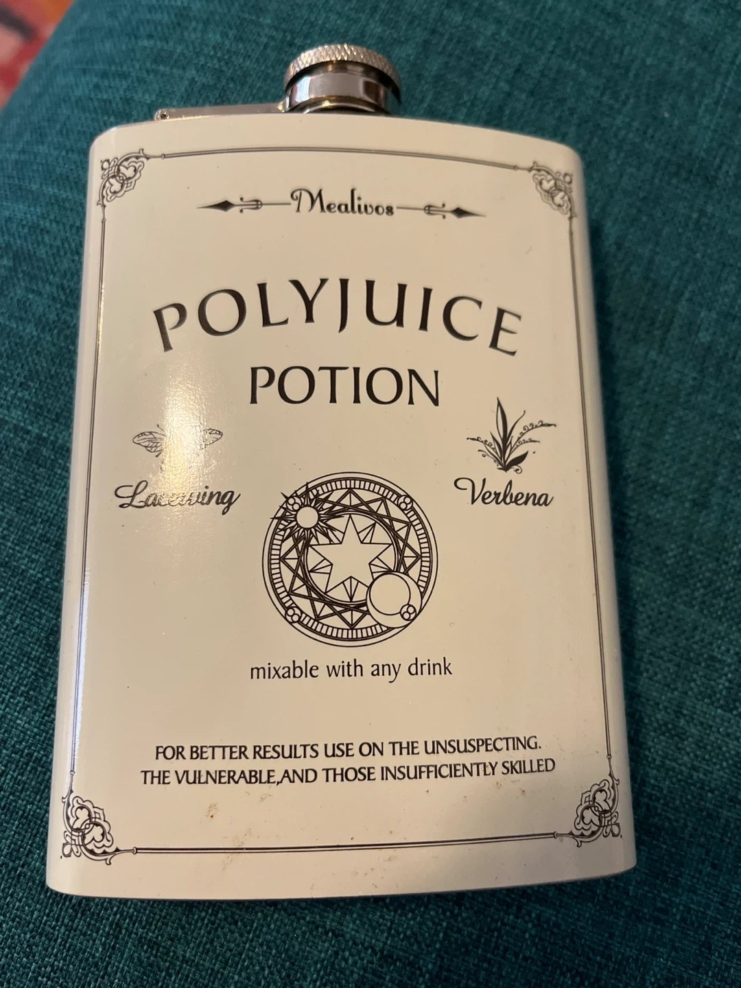 Selling a Mealivos flask with a Polyjuice Potion design. It's made of stainless steel 304 and is mixable with any drink. The design includes Lacewing and Verbena. Perfect for any Harry Potter fan!