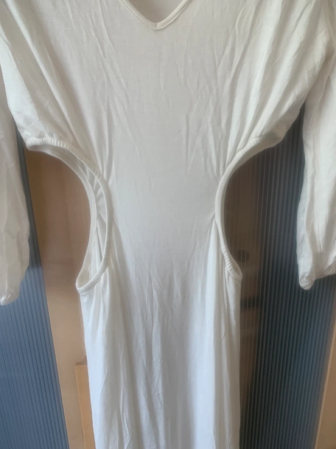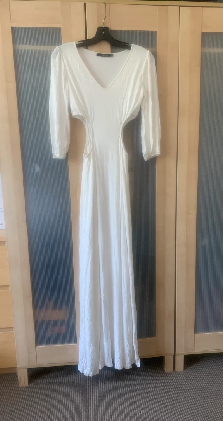 Selling a beautiful Ark & Co. white maxi dress in size small! It features a flattering V-neck and unique cut-out details on the sides. The lined dress is in great condition. It's made of a lightweight material, making it super comfortable to wear!