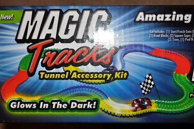 Get ready for some fun with this Magic Tracks Tunnel Accessory Kit! It glows in the dark, adding an extra level of excitement to playtime. The set includes: - Start/Finish Gate - Road Blocks - Square Signs - Trees - Peel 'N Stick Decals Comes in its original packaging!