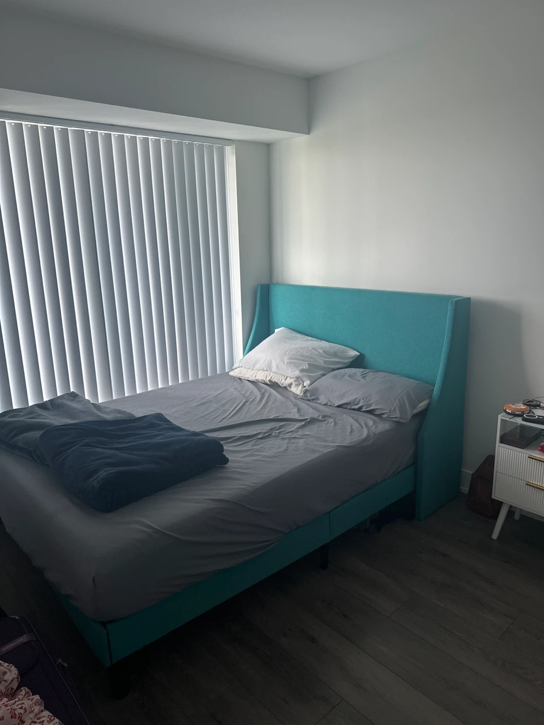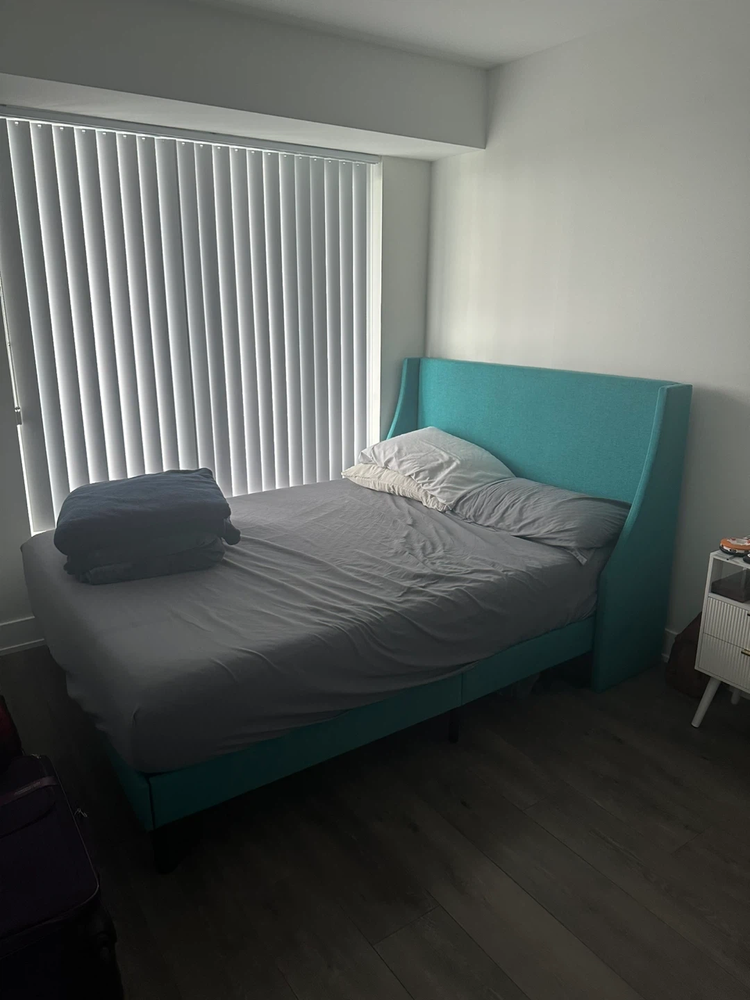 Selling a bed frame with a teal wingback headboard. It's in great condition and would look lovely in any bedroom!
