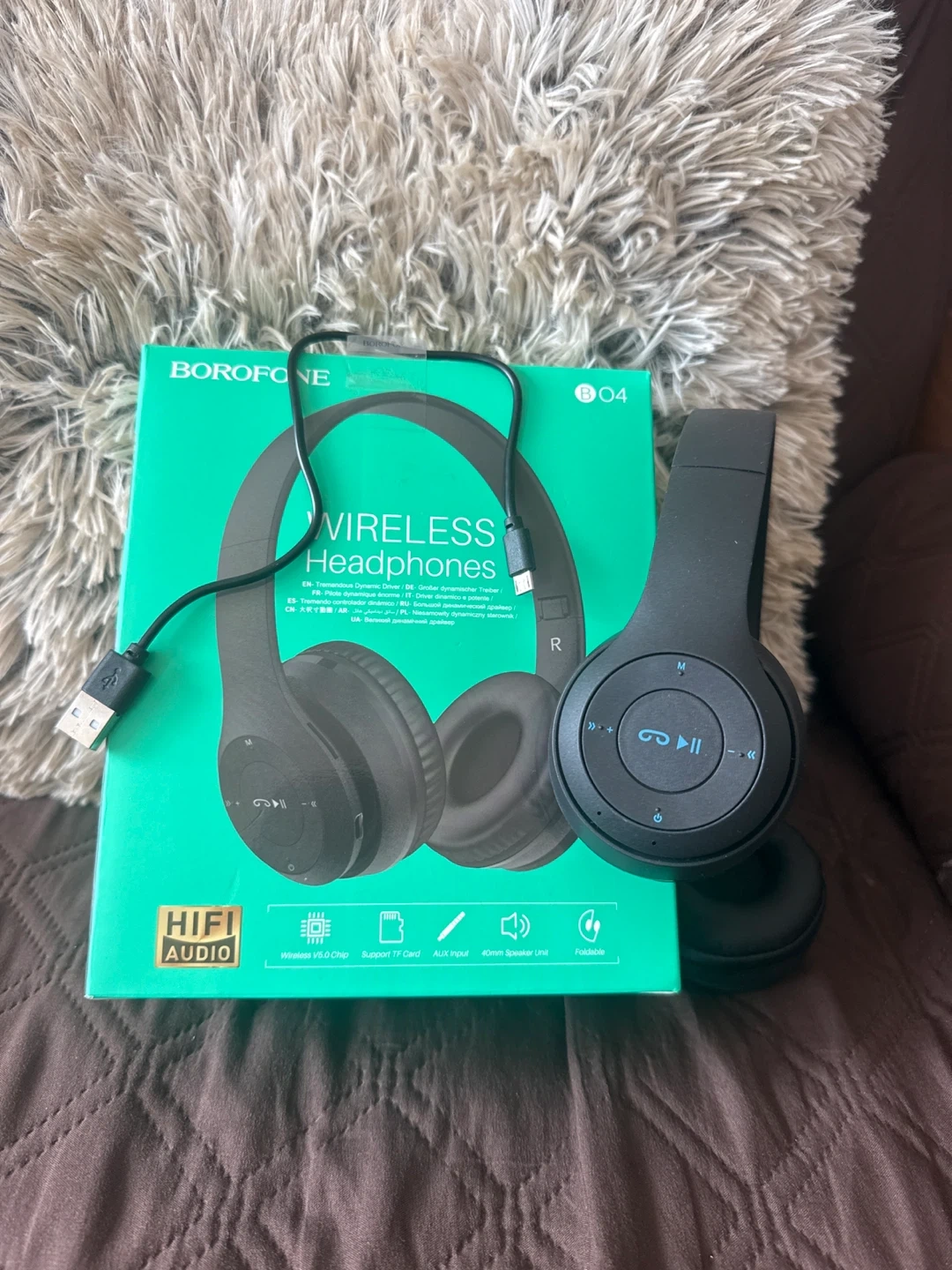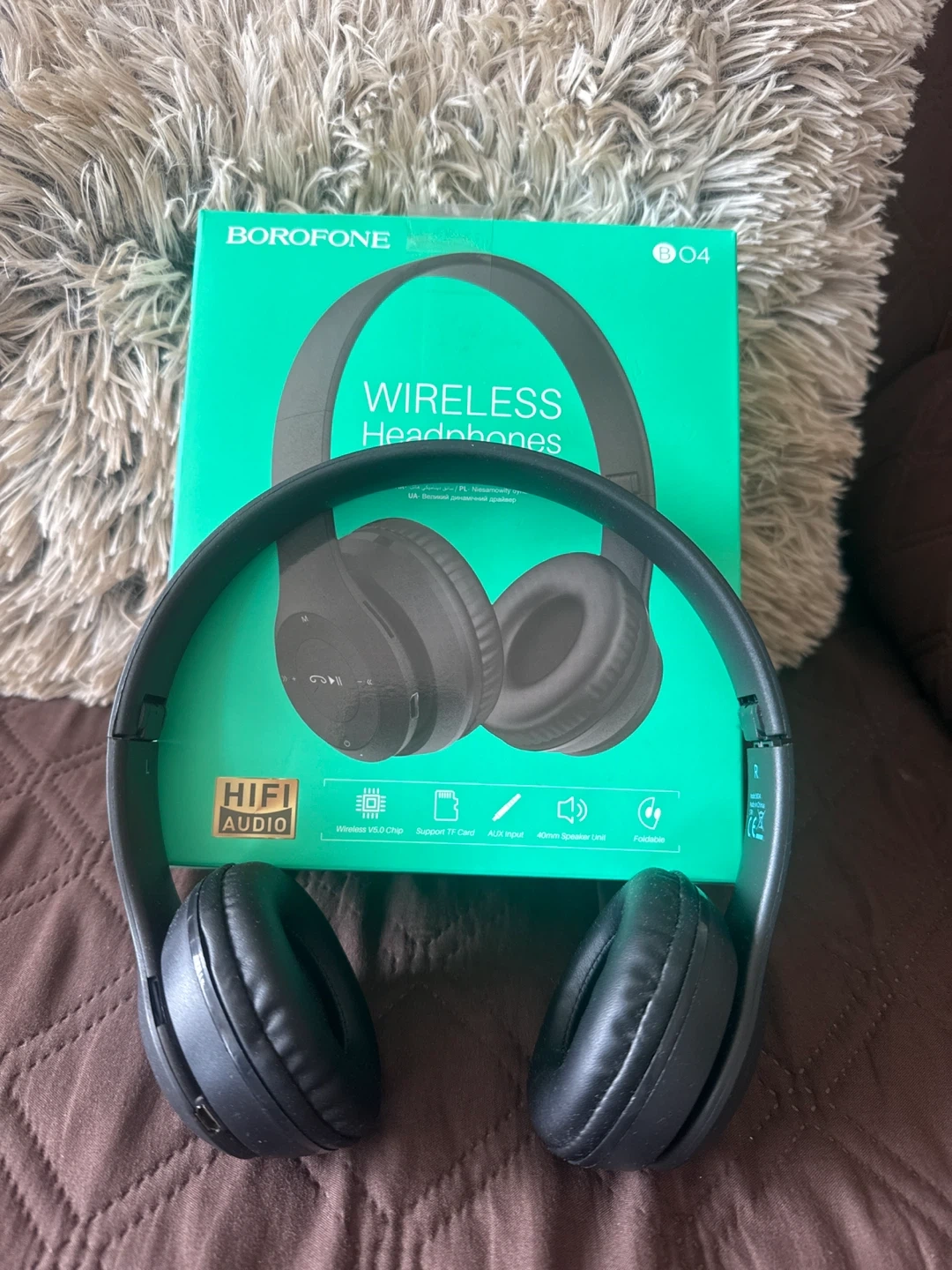Selling a pair of Borofone BO4 wireless headphones in black! They're in great condition and come with the box and USB charging cable. These headphones feature HiFi audio, wireless V5.0 chip, support TF card, AUX input and 40mm speaker unit.