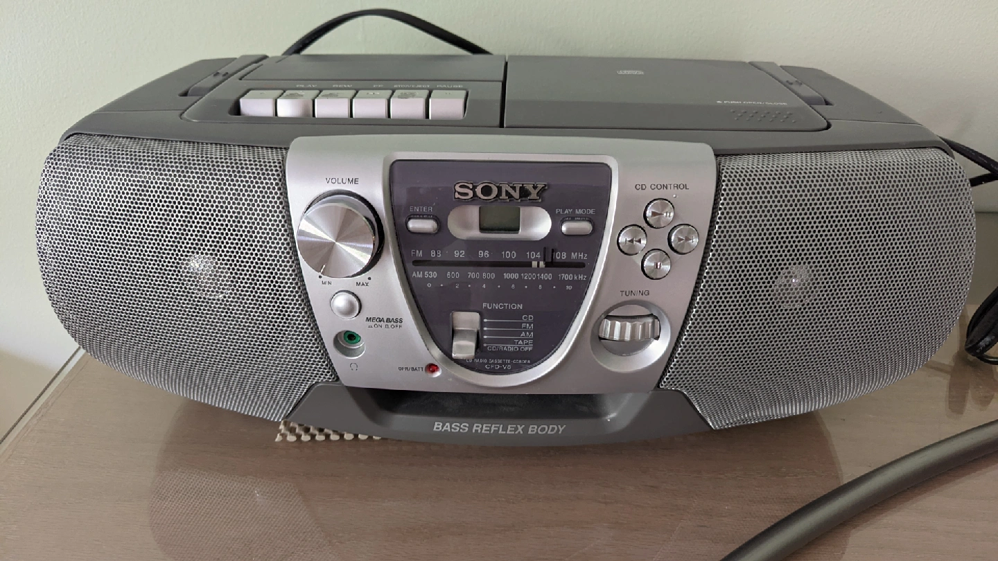 Selling a Sony boombox! This retro portable CD/radio player is perfect for listening to your favourite tunes or the radio. It features a CD player, radio, and cassette player. It even has a 3.5mm jack and can run on batteries if needed.