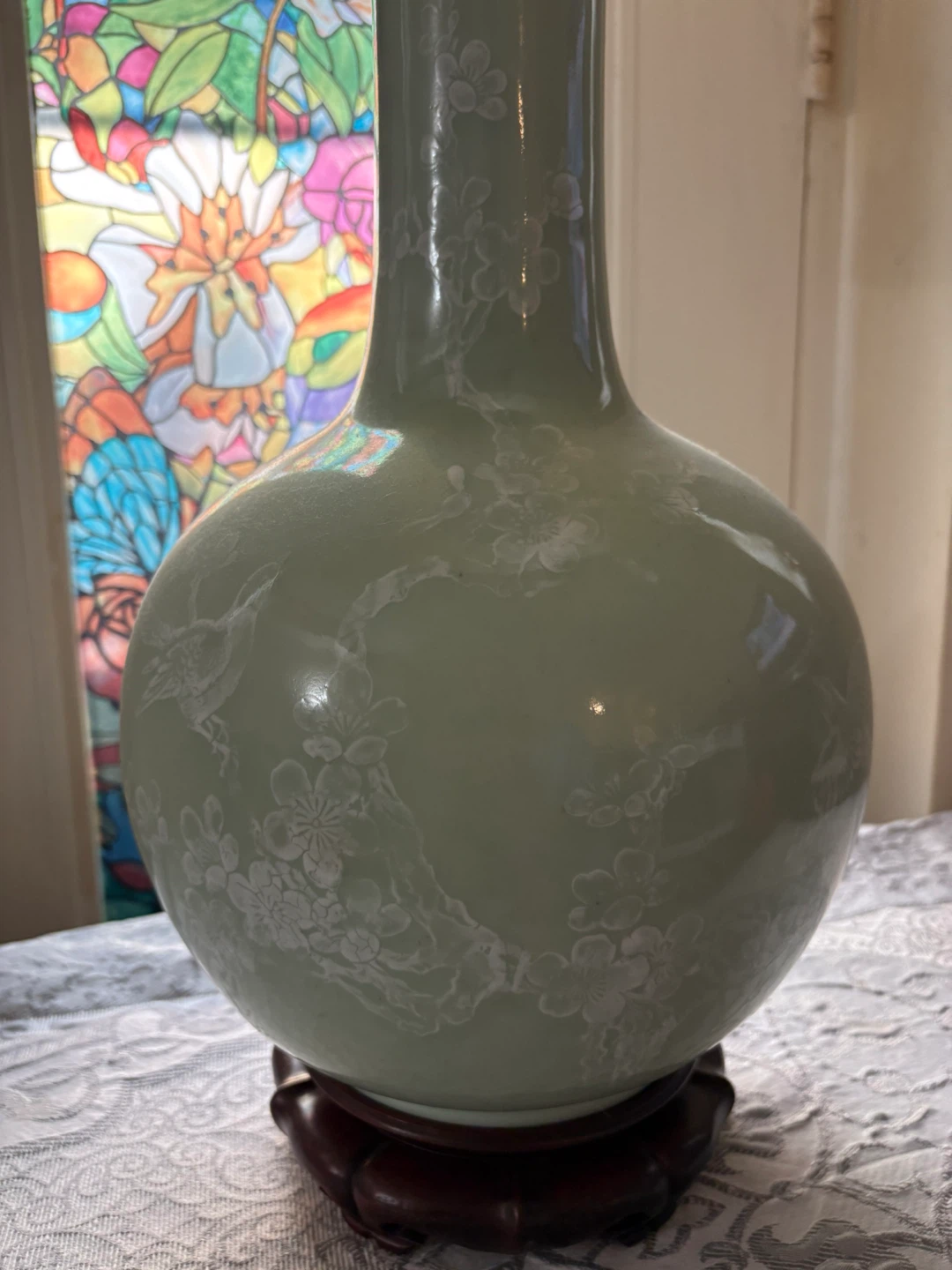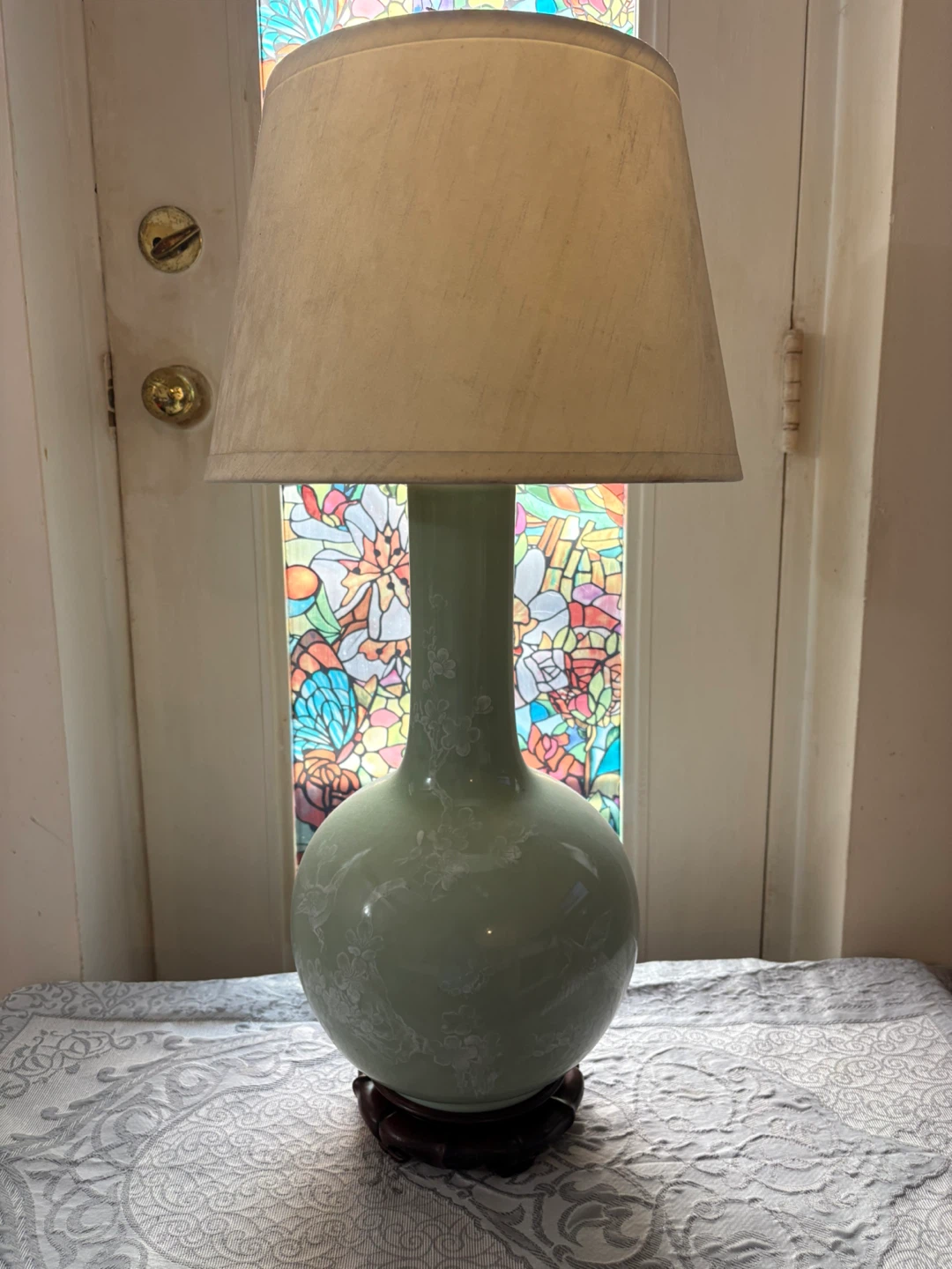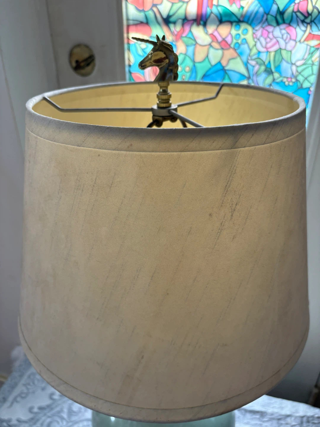This is a unique Asian themed lamp with a unicorn figure at the top. It has a light green vase-like base with floral designs. The lampshade is a neutral colour. It would look great in any room!