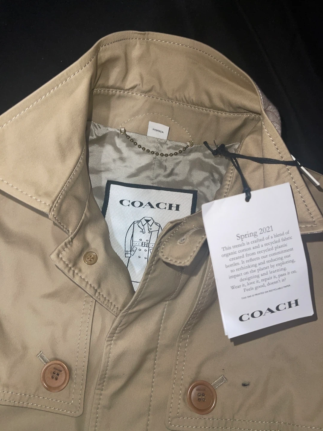 Selling a Brand New Women’s Coach Spring 2021 trench coat in a size small. This trench is crafted of a blend of organic cotton and a recycled fabric created from recycled plastic bottles. It reflects our commitment to rethinking and reducing our impact on the planet by exploring, designing, and learning ways to love it. Wear it, love it, pass it on. 10/10 Condition Message for more details