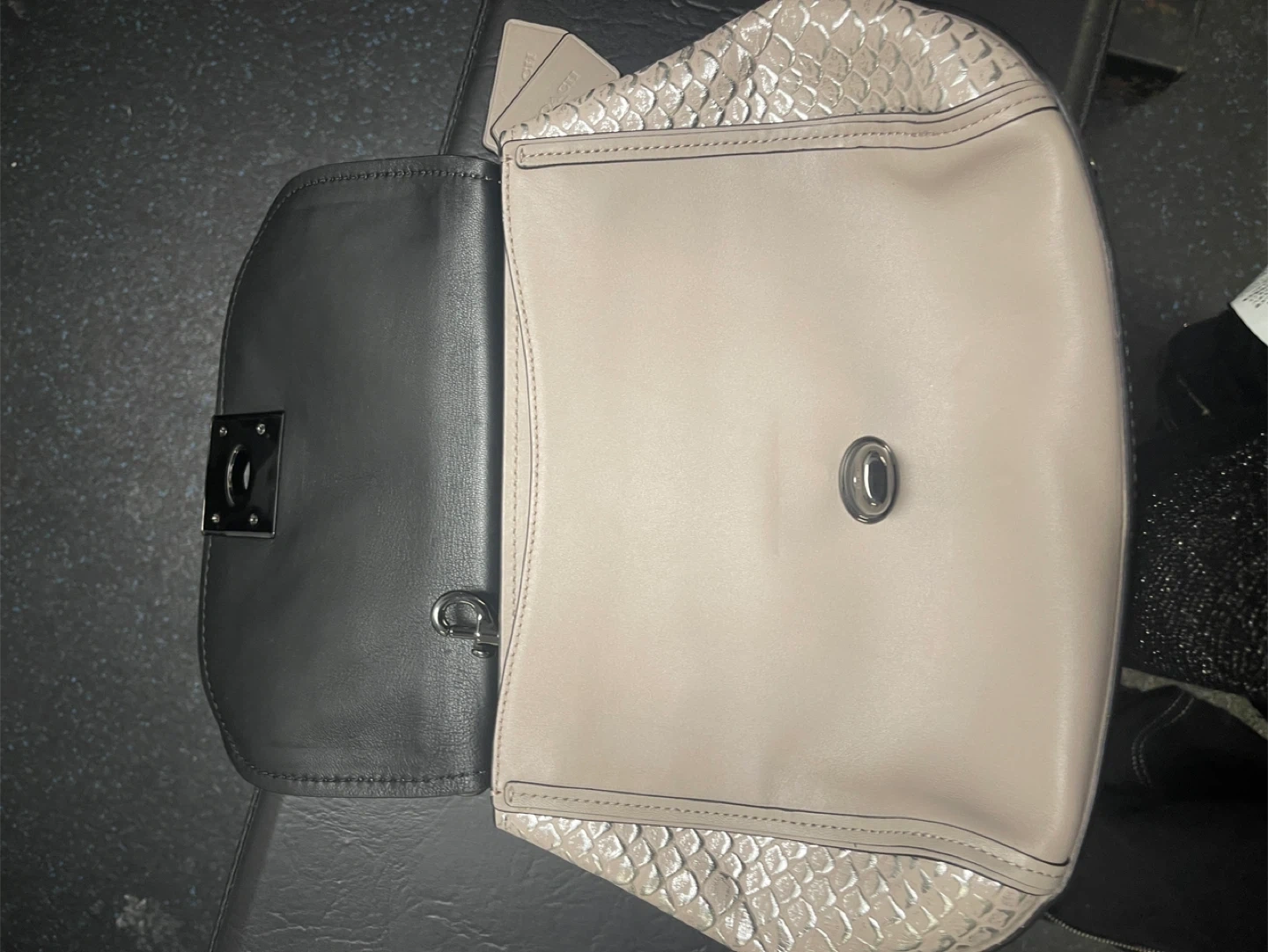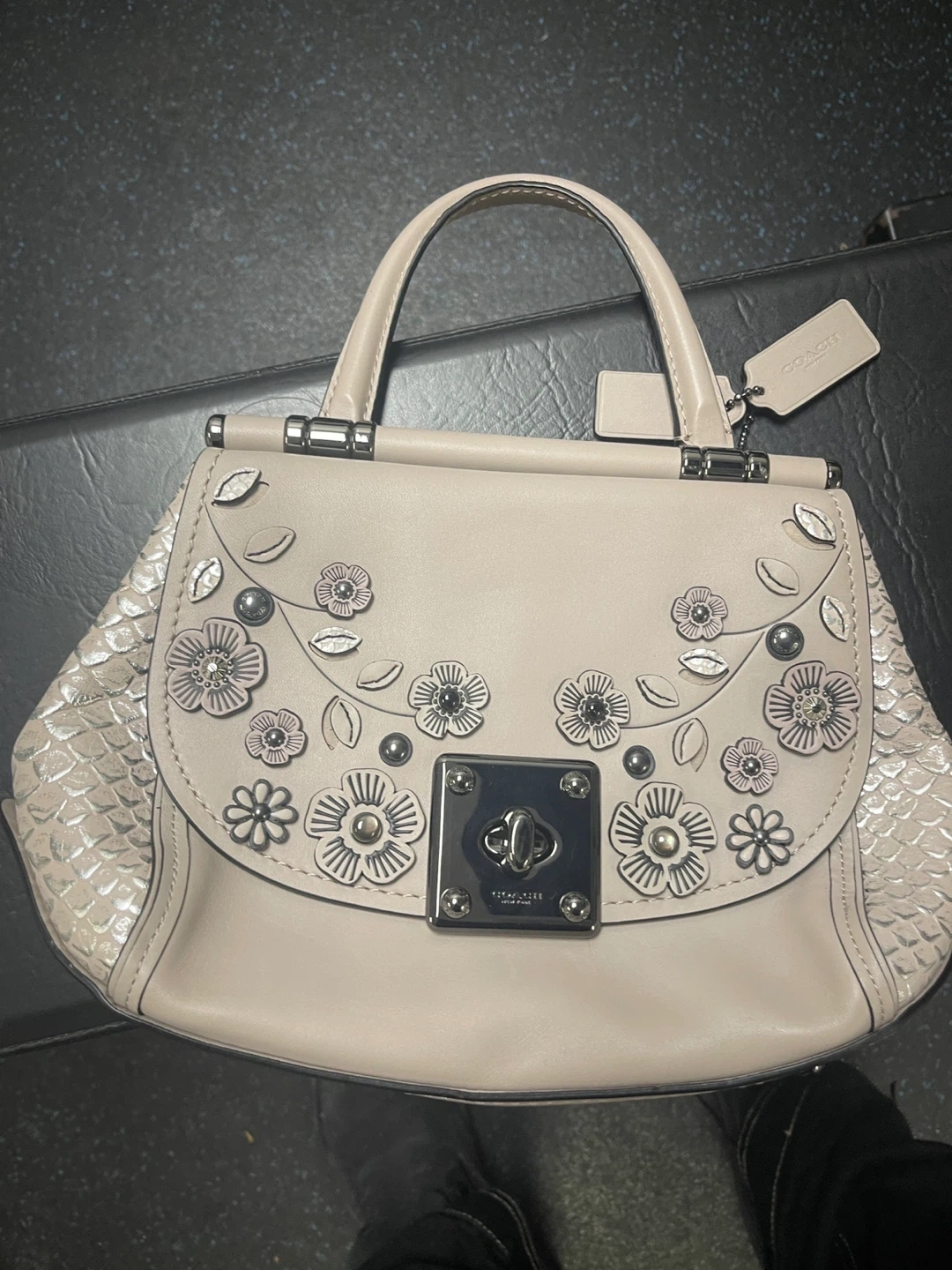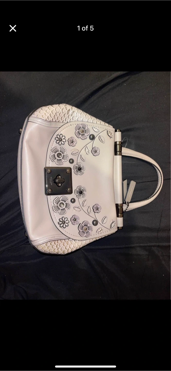 Selling a Brand New coach handbag with floral appliqué detailing! It's a beautiful leather purse in a light colour with silver hardware. The interior is black and includes a zippered pocket. It also comes with a detachable strap. 10/10 Condition Message me for more details