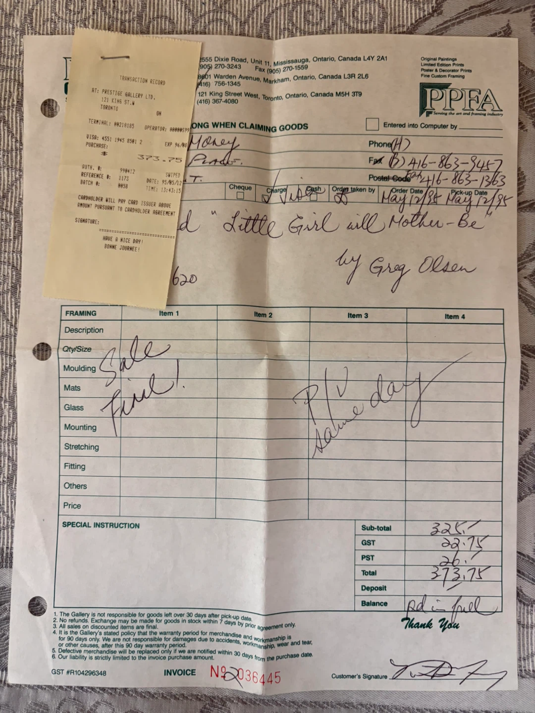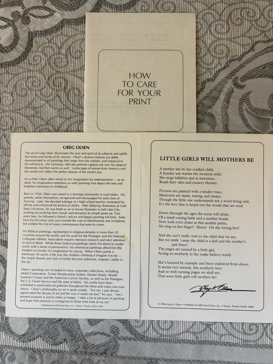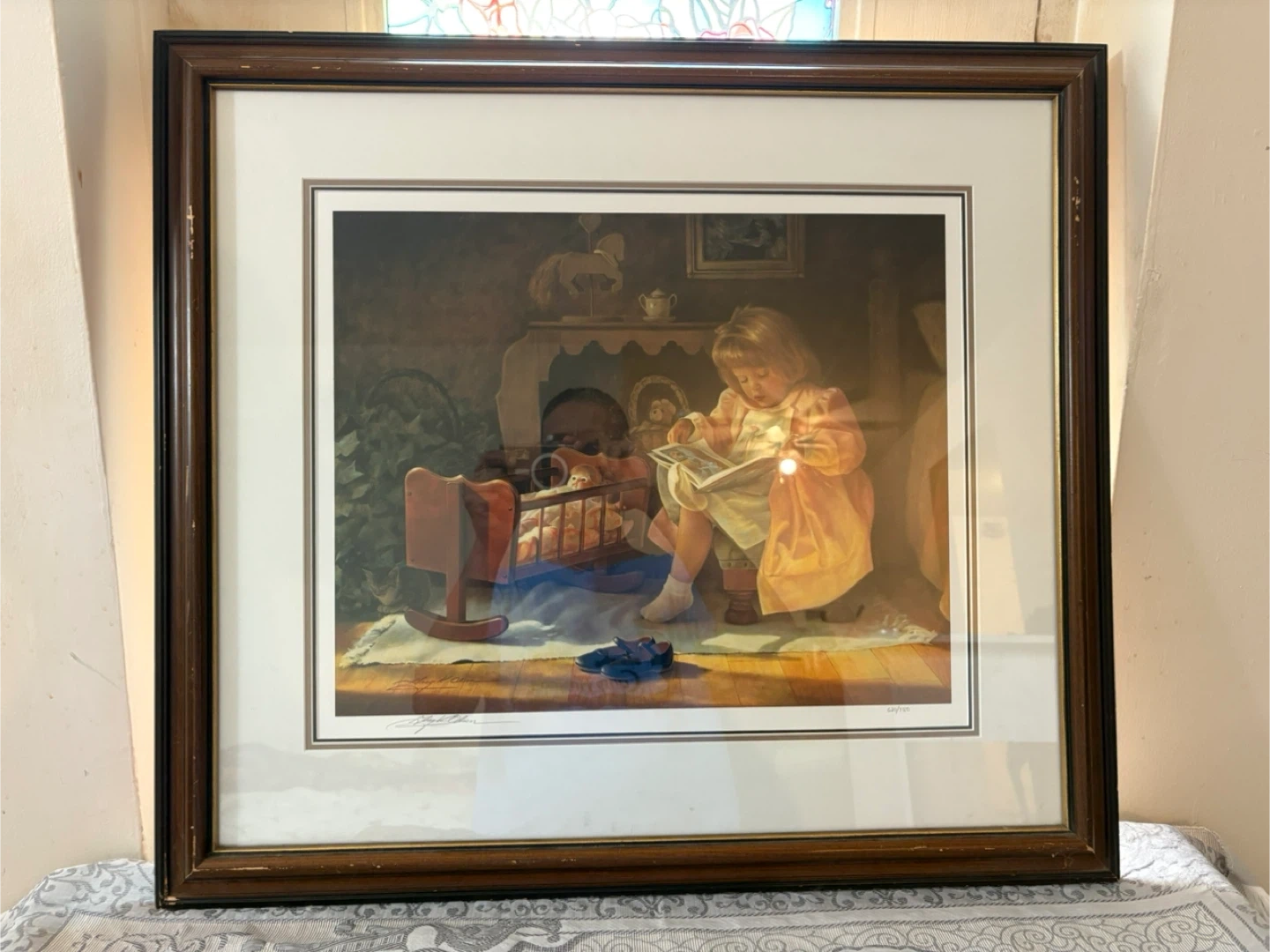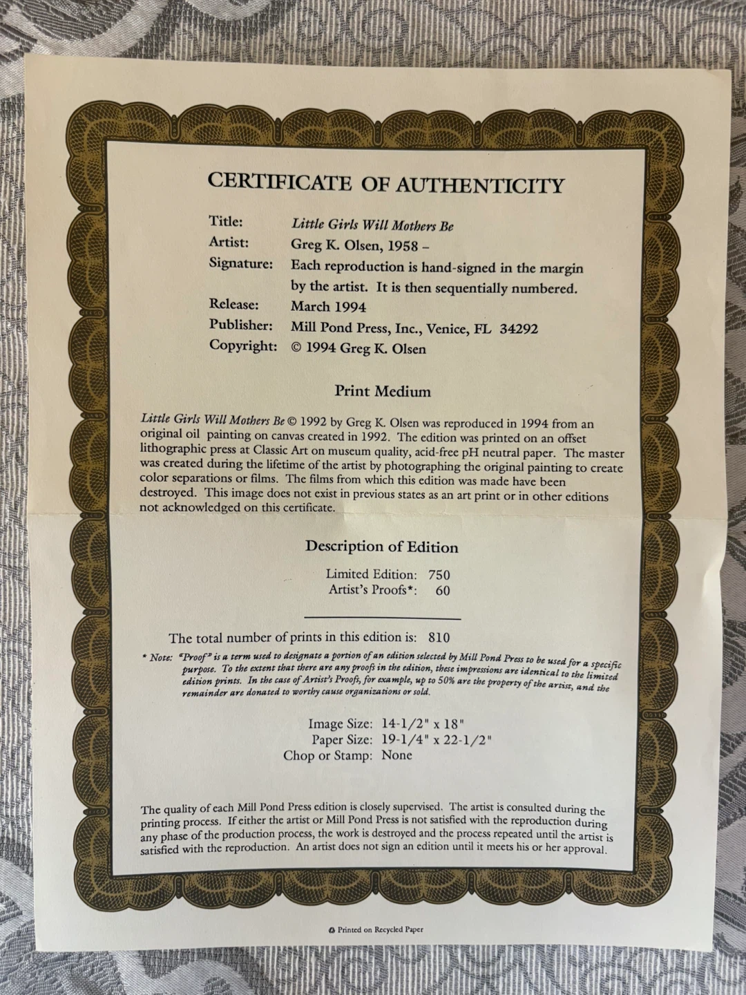 Selling a framed print of "Little Girls Will Mothers Be" by Greg K. Olsen. Comes with the original bill of sale, certificate of authenticity and inserts from the Gallery. This limited edition print is numbered 620/750 and is signed by the artist. The image size is 14-1/2" x 18" and the paper size is 19-1/4" x 22-1/2". Originally purchased for $373.75 at ATI Prestige Gallery in Toronto