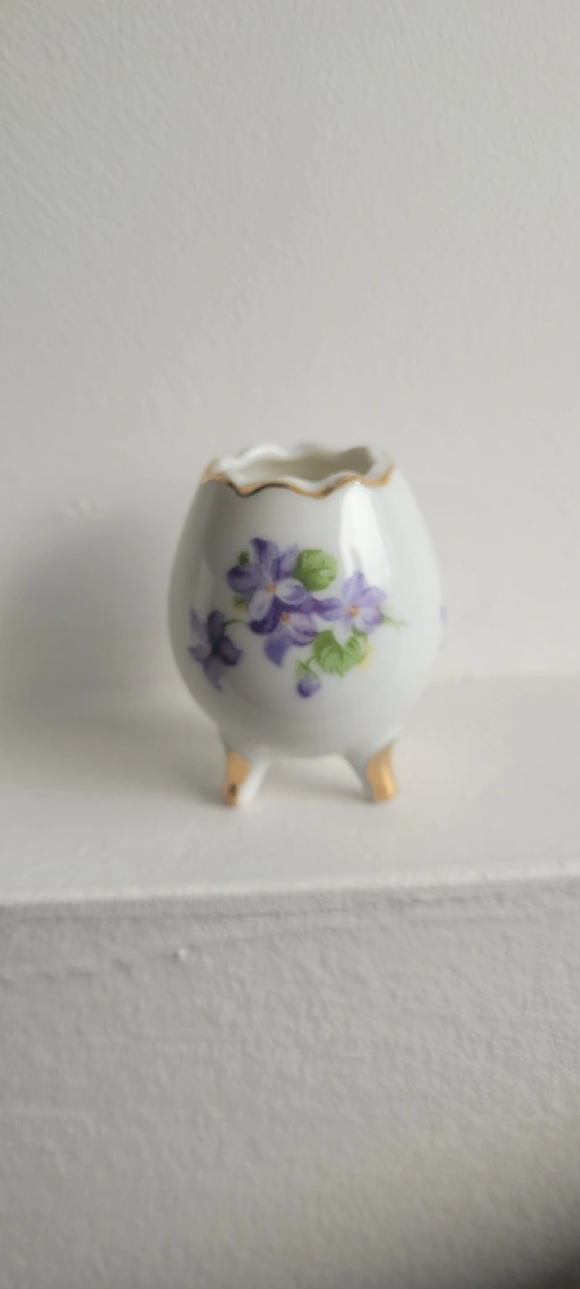 This is a cute little vintage egg cup! It has a white base with a lovely floral design featuring purple flowers and green leaves. The rim and feet are accented with gold paint. It's in great condition and would make a charming addition to any breakfast table or vintage collection