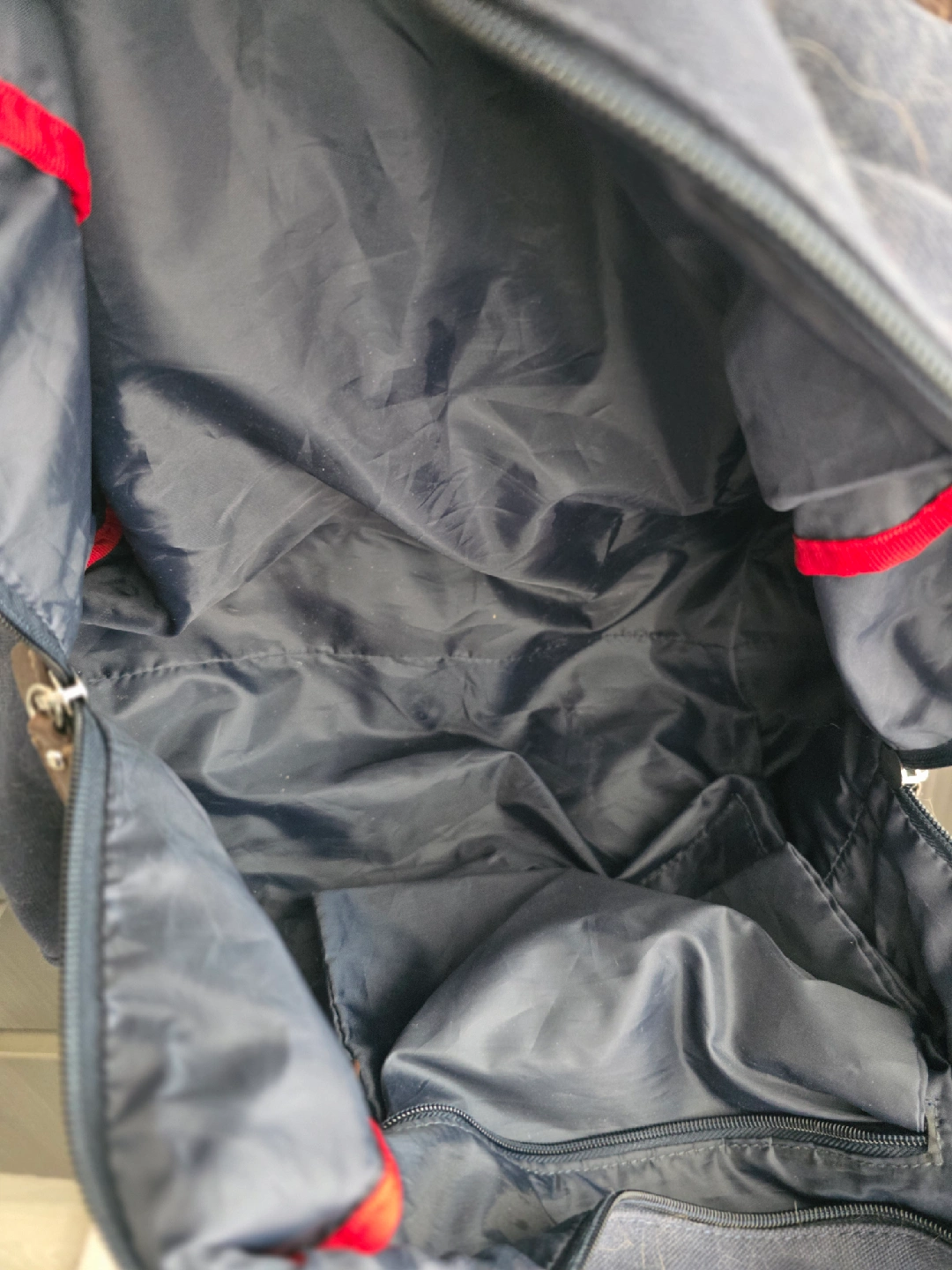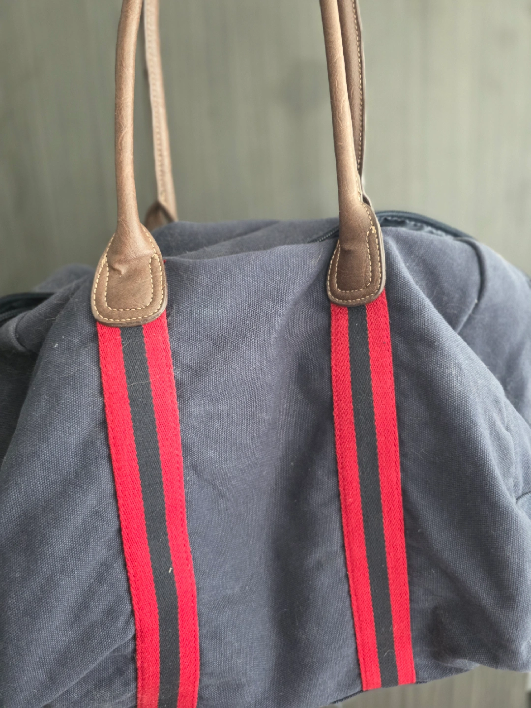 96Tommy Hilfiger duffle bag in navy blue with red and black stripe detailing. The bag has brown leather handles and a zipper closure. It's in good condition and ready for your next adventure
