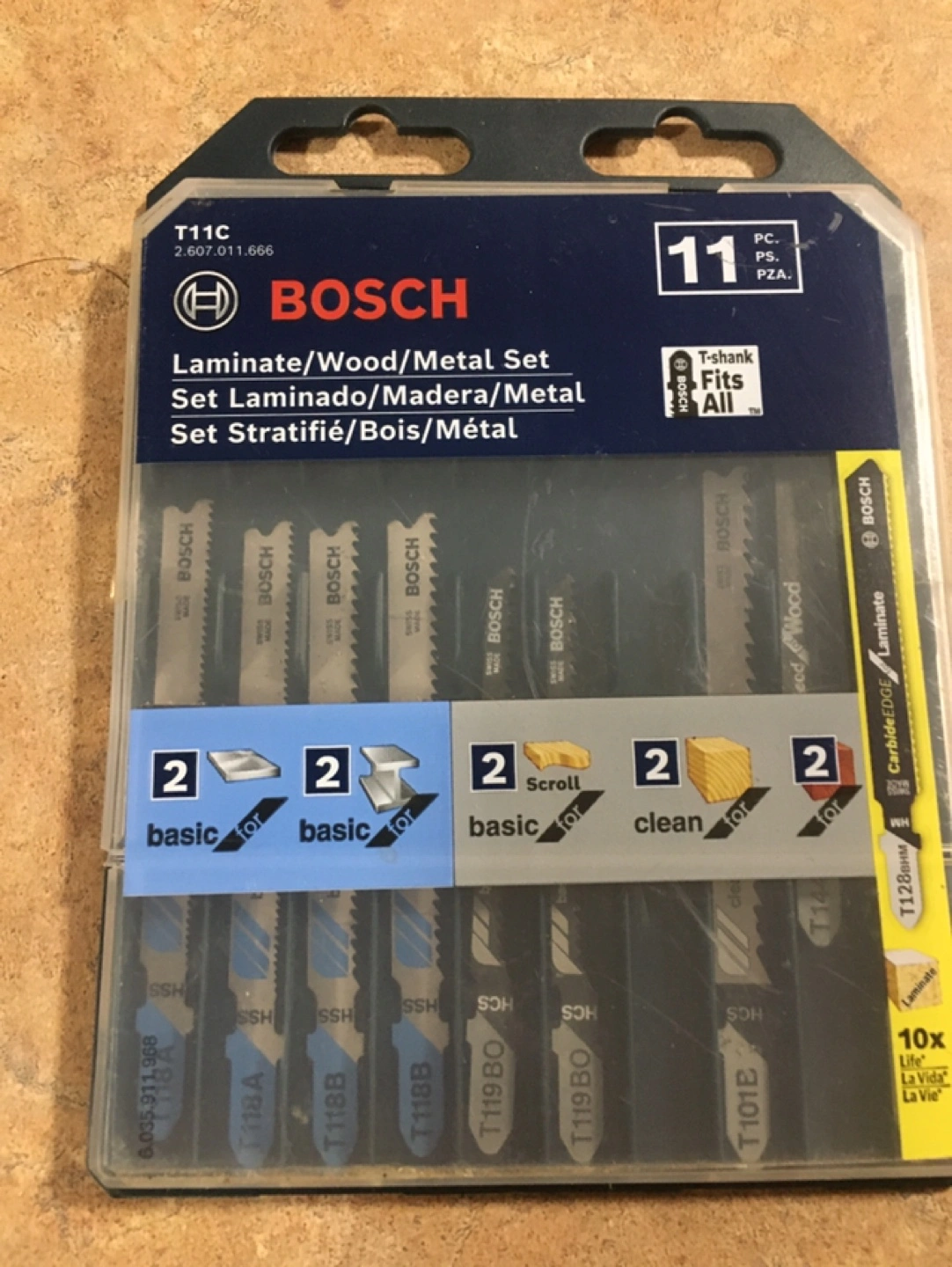 Selling a brand new Bosch 11-piece jigsaw blade set! Perfect for various materials like laminate, wood, and metal. The set includes blades for basic cuts, scroll cuts, and clean cuts. T-shank fits all jigsaws.
