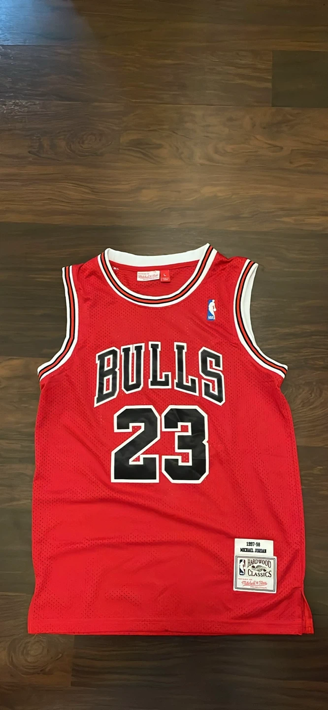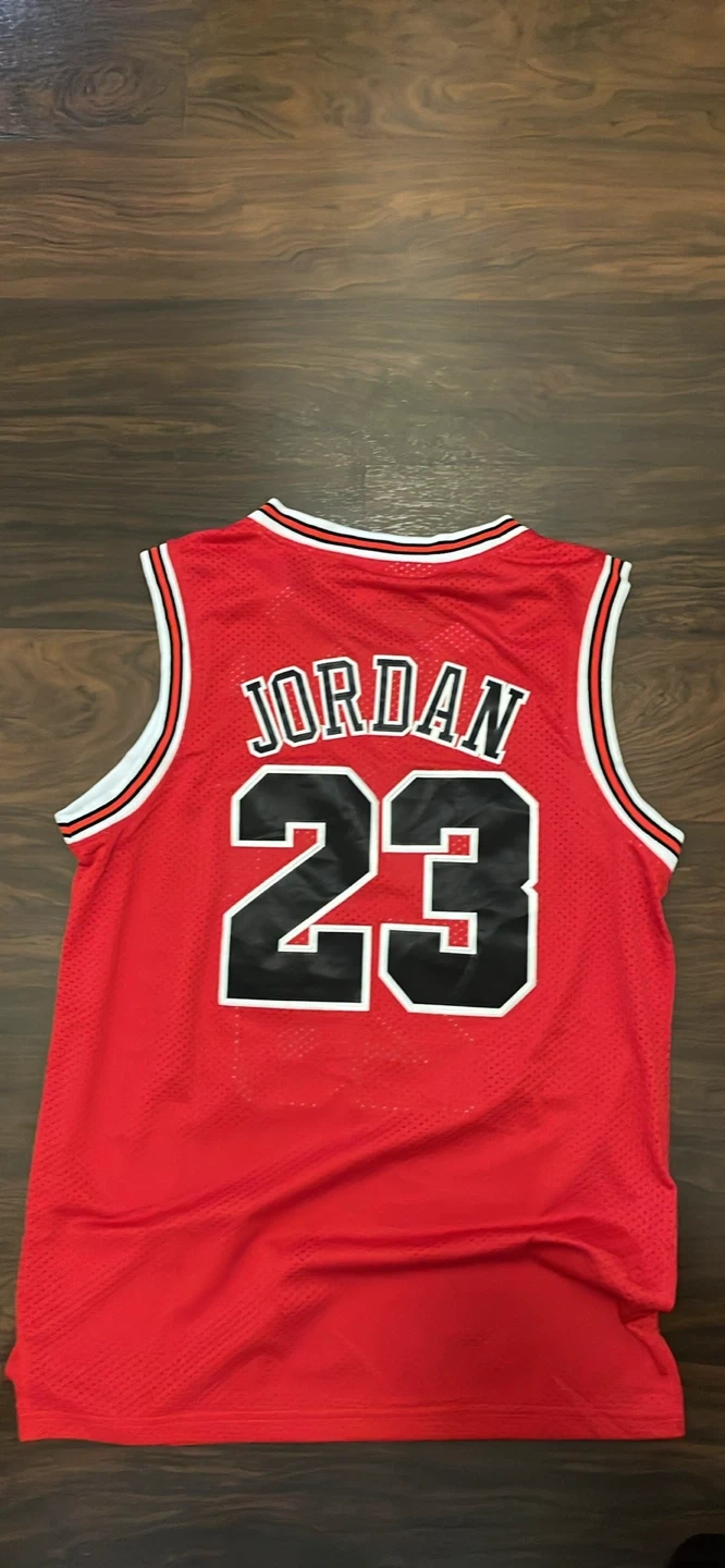 Selling a Michael Jordan #23 Chicago Bulls jersey. It's red with white and black trim. The jersey is in great shape and ready for a new home!