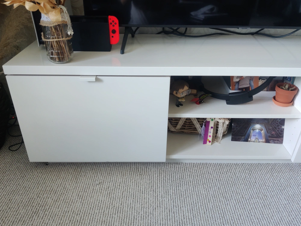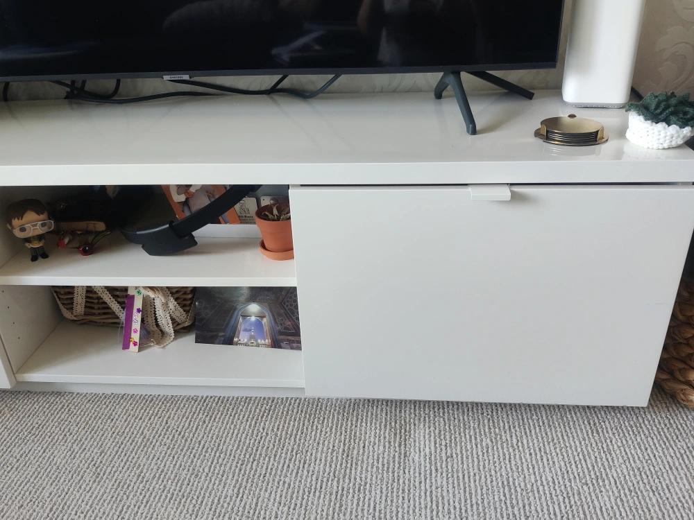 Selling a white IKEA BESTA TV unit. It's in great shape and perfect for organizing your entertainment area! It has storage with doors and open shelves for your devices and accessories