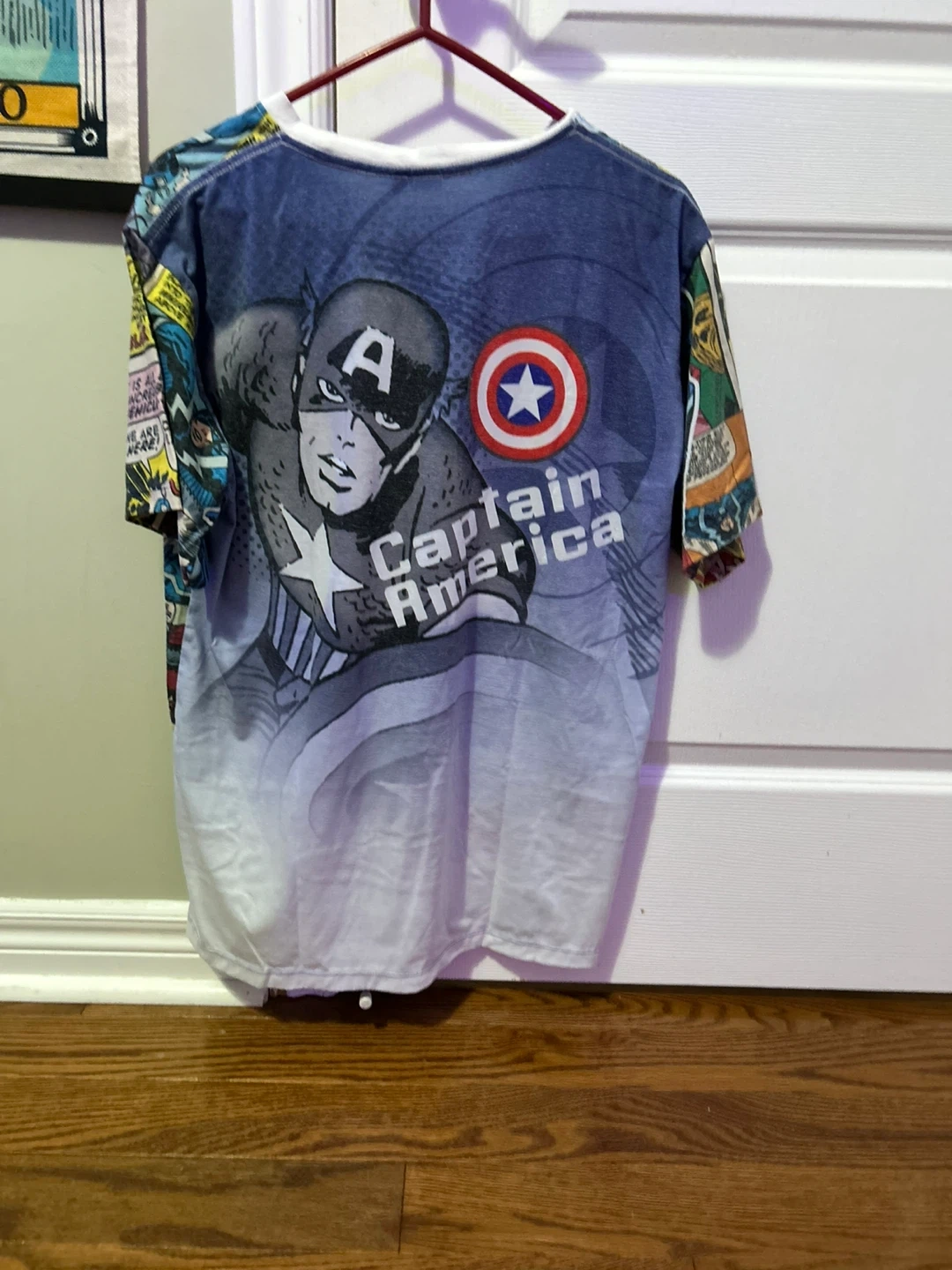 Captain America comic print t-shirt in good condition! The shirt features a vibrant and detailed comic book design with Captain America. A fun piece for any Marvel fan!
