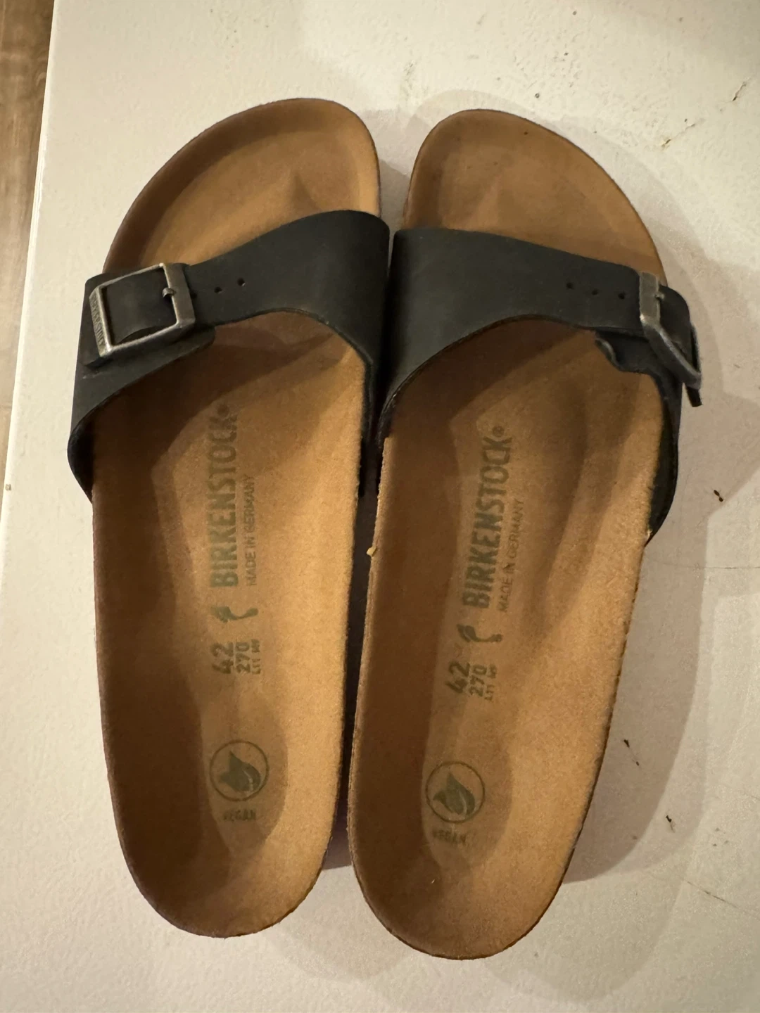 Selling a brand new never worn pair of Birkenstock Arizona sandals in black vegan material! They are size 42, which is a US size 11. Tags and box recycled before I could return.