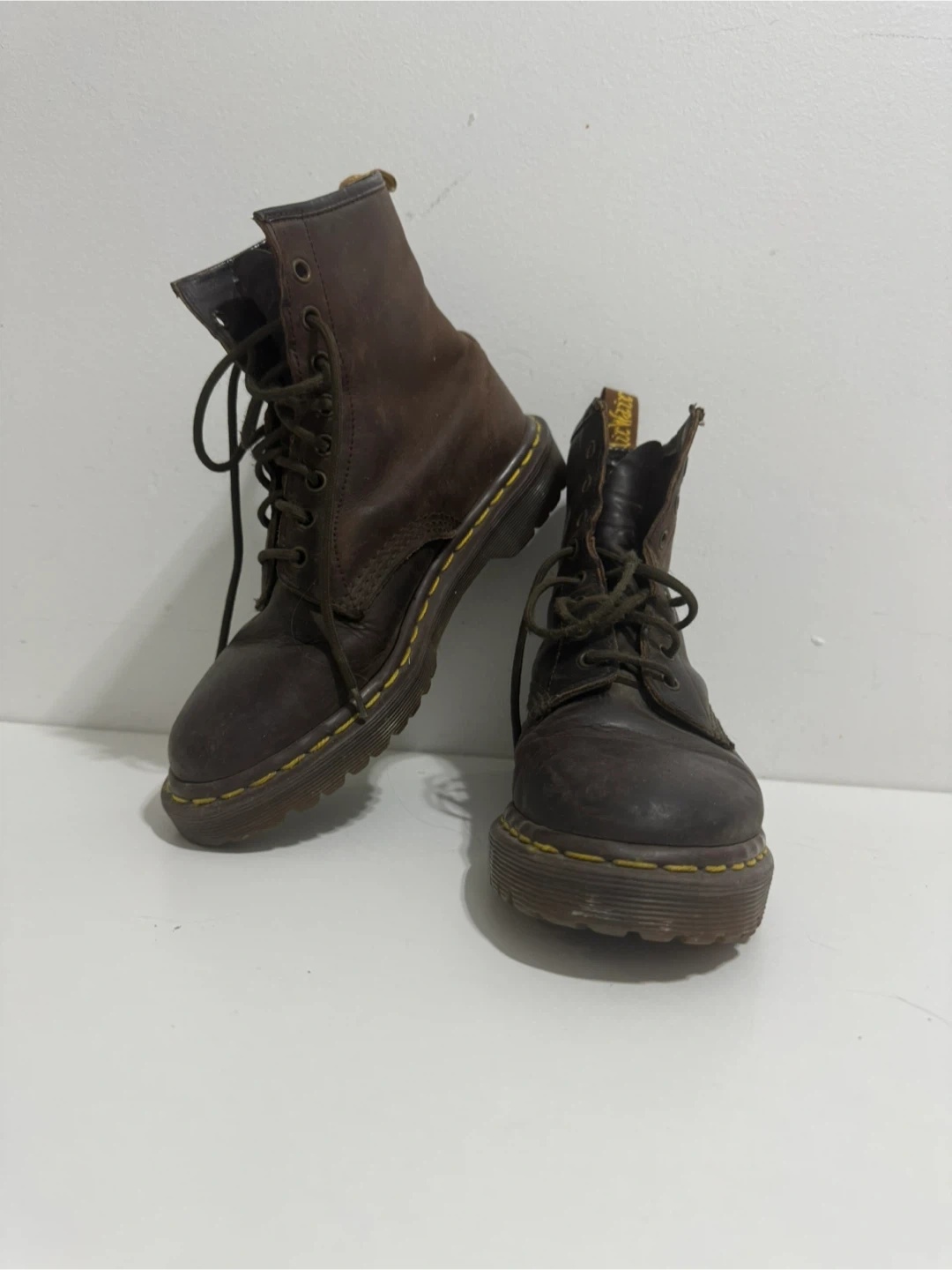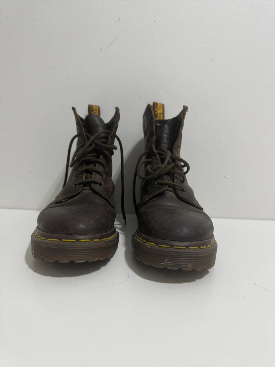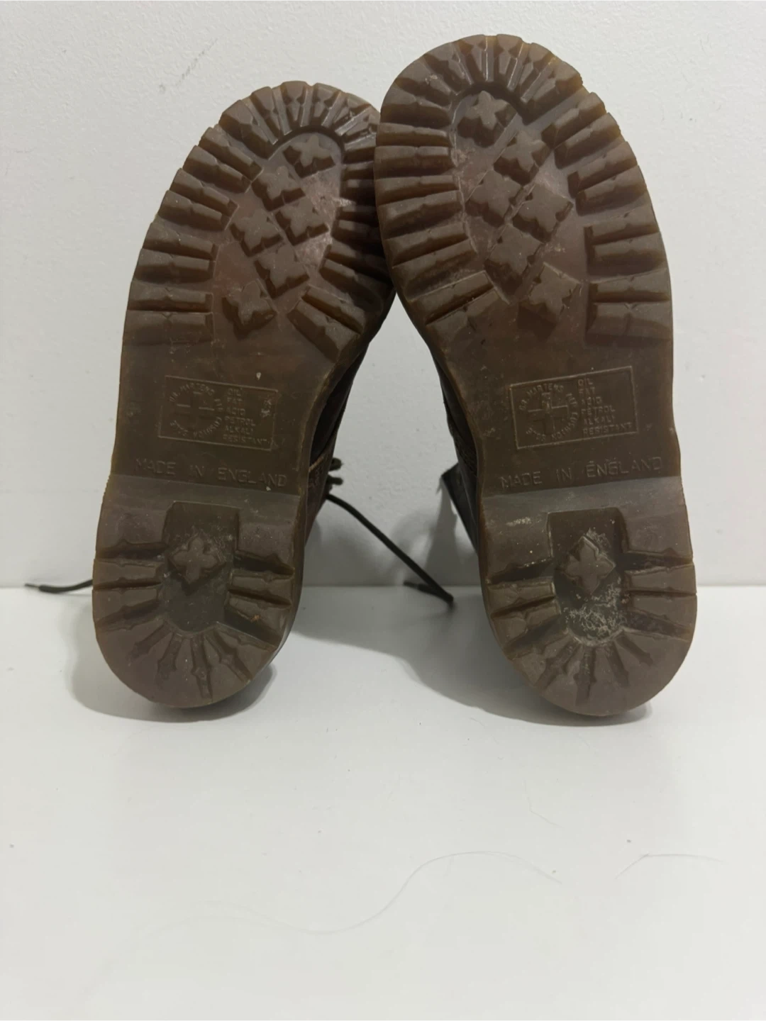 Selling a pair of Dr. Martens ankle boots in brown leather. They have some signs of wear, as you can see in the photos, but they're still in good shape. The soles are man-made and the uppers are leather. - Made in England!!