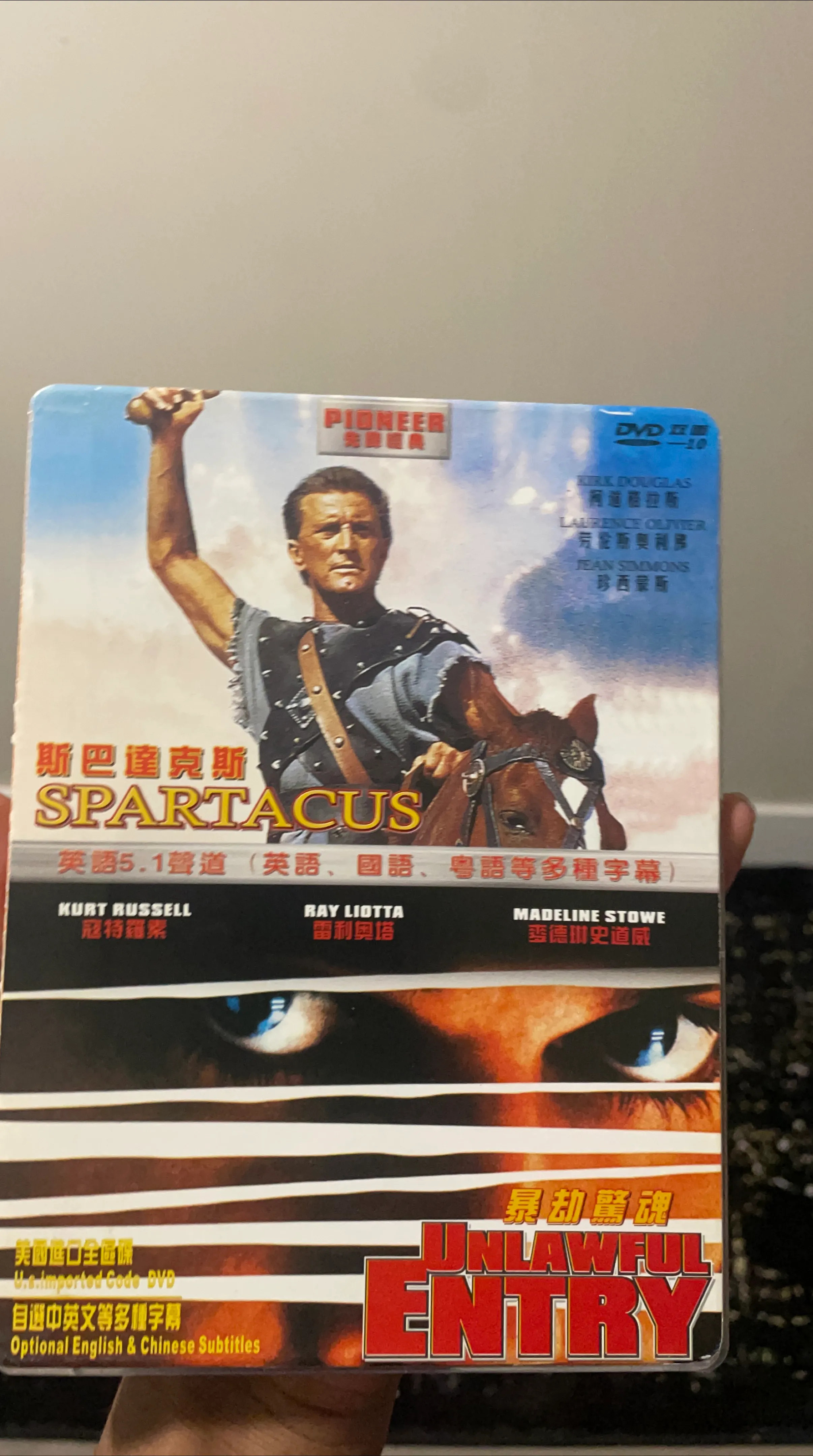 Selling a double feature DVD set featuring Spartacus and Unlawful Entry. Spartacus stars Kirk Douglas, Laurence Olivier, and Jean Simmons. Unlawful Entry stars Kurt Russell, Ray Liotta, and Madeline Stowe. Both DVDs have optional English and Chinese subtitles and are U.S. imported Code DVDs