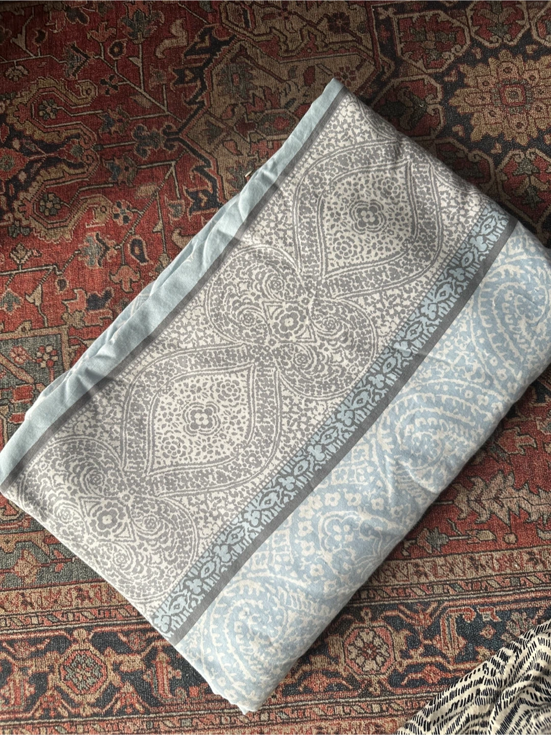 Selling a lovely patterned bedding set with a soft blue and grey design. It's in great condition and would add a nice touch to any bedroom. Perfect for a cozy and stylish sleep!
