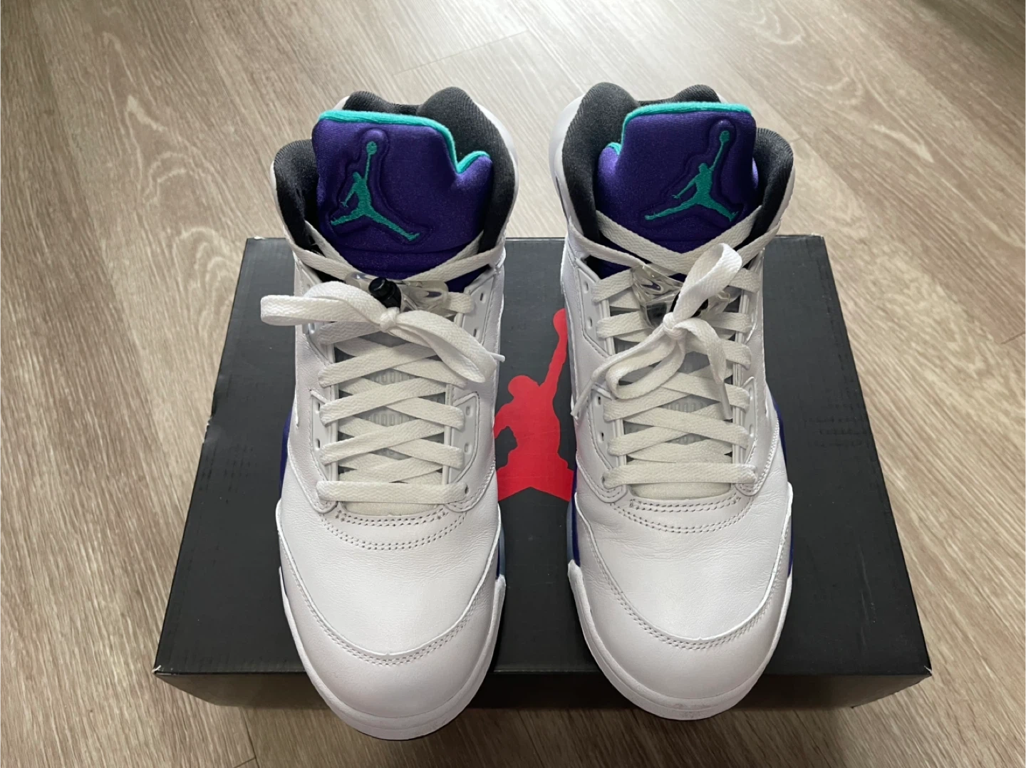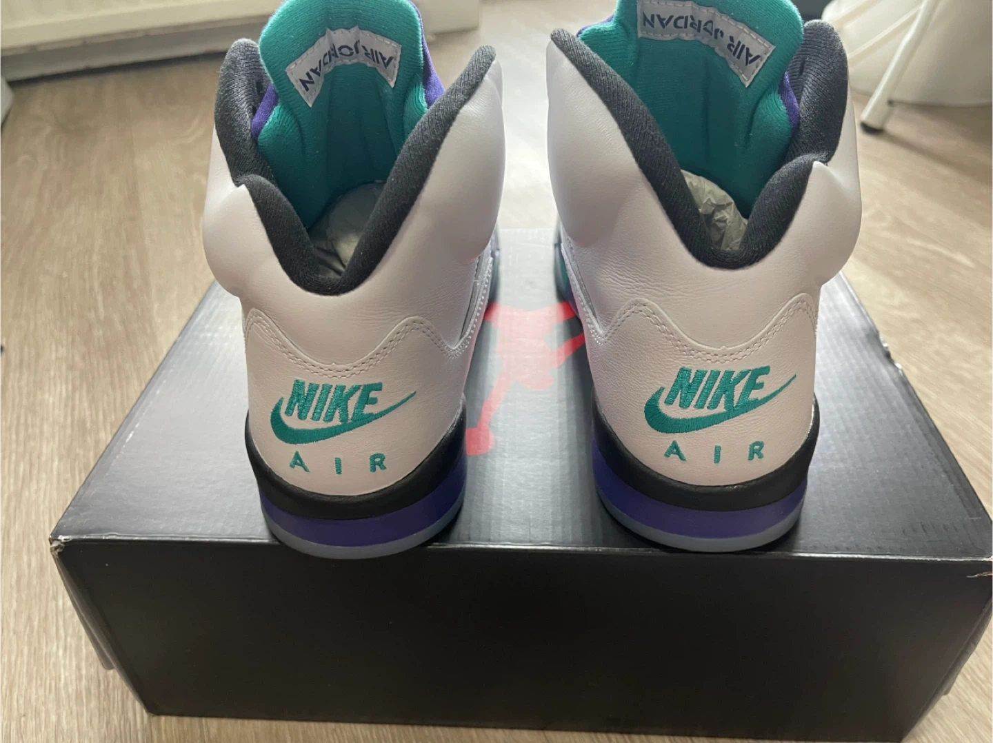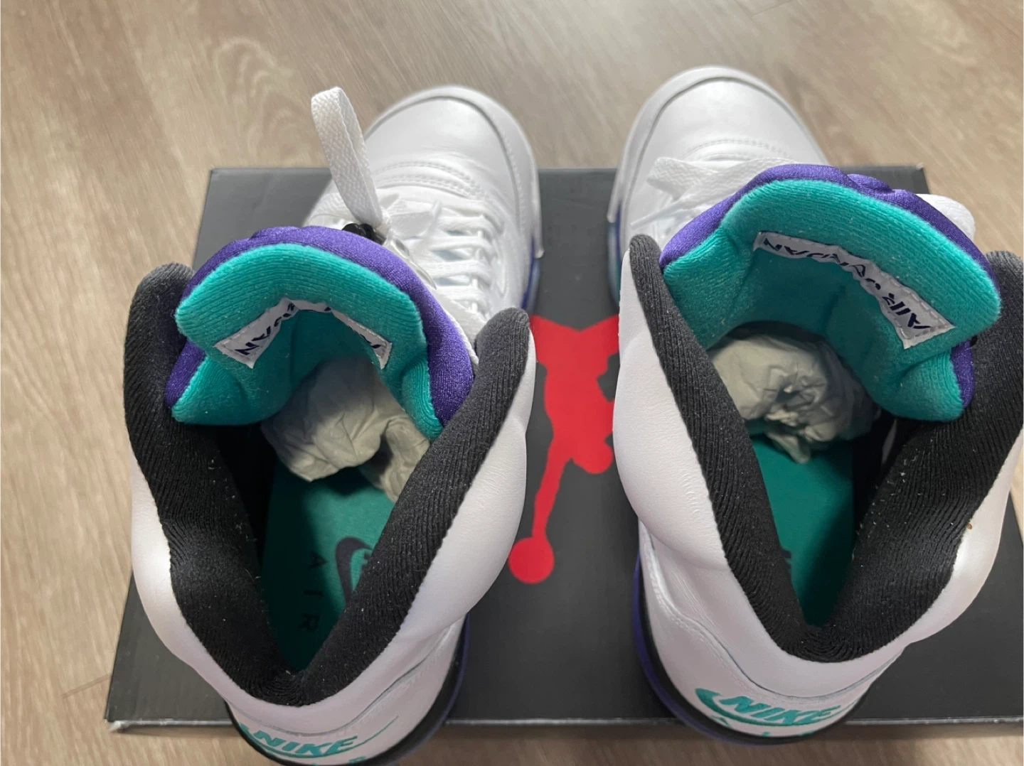 Classic Air Jordan 5 sneakers in the "Grape" colourway. Features white leather uppers with purple and teal accents. Includes original box. These kicks are ready for your collection!