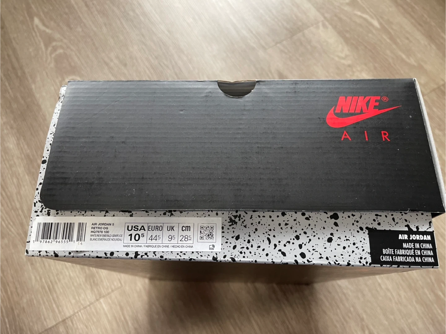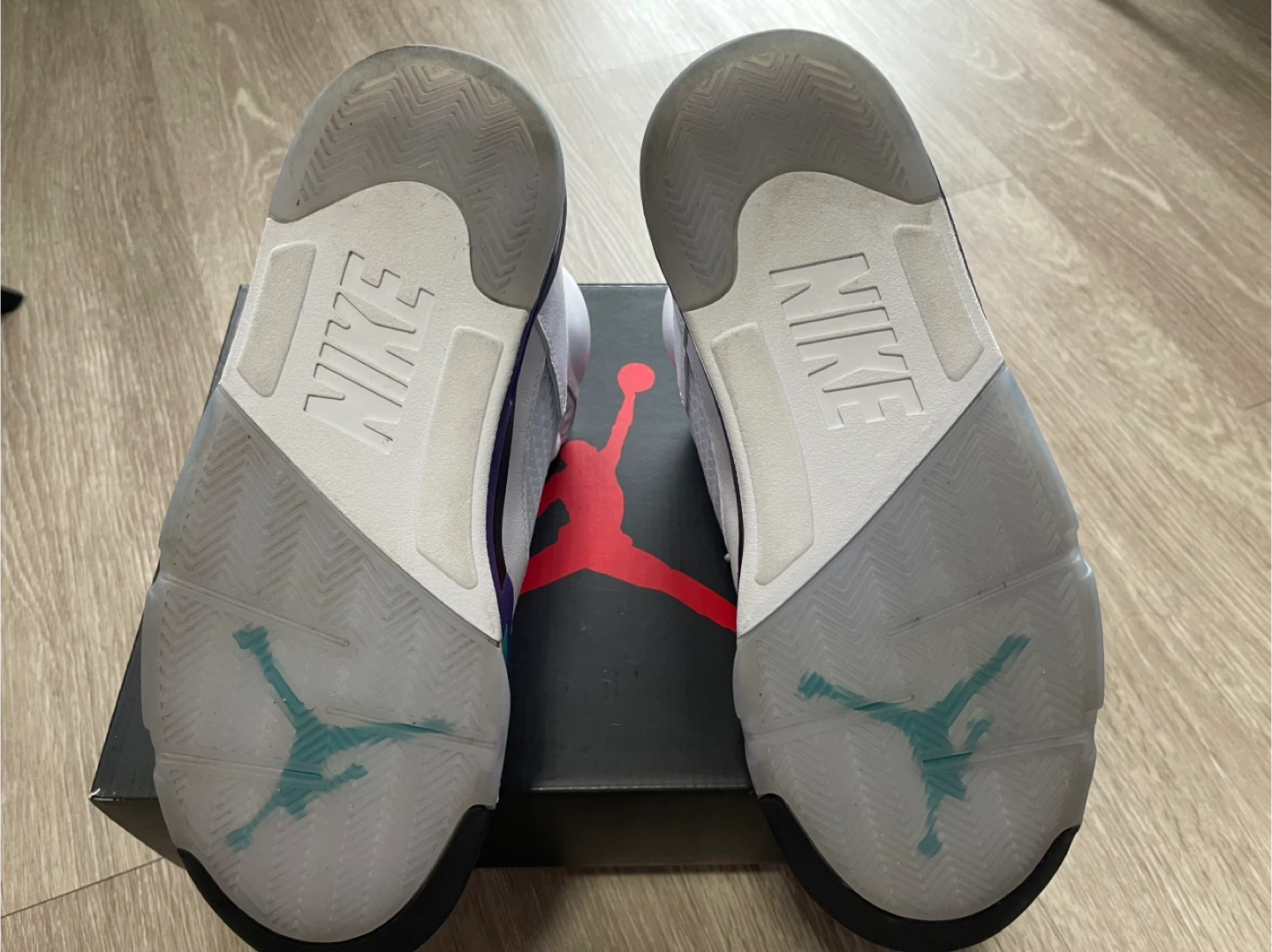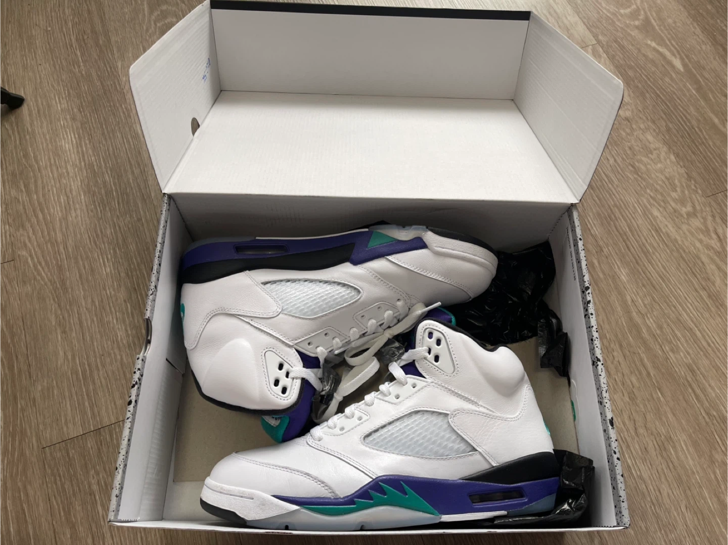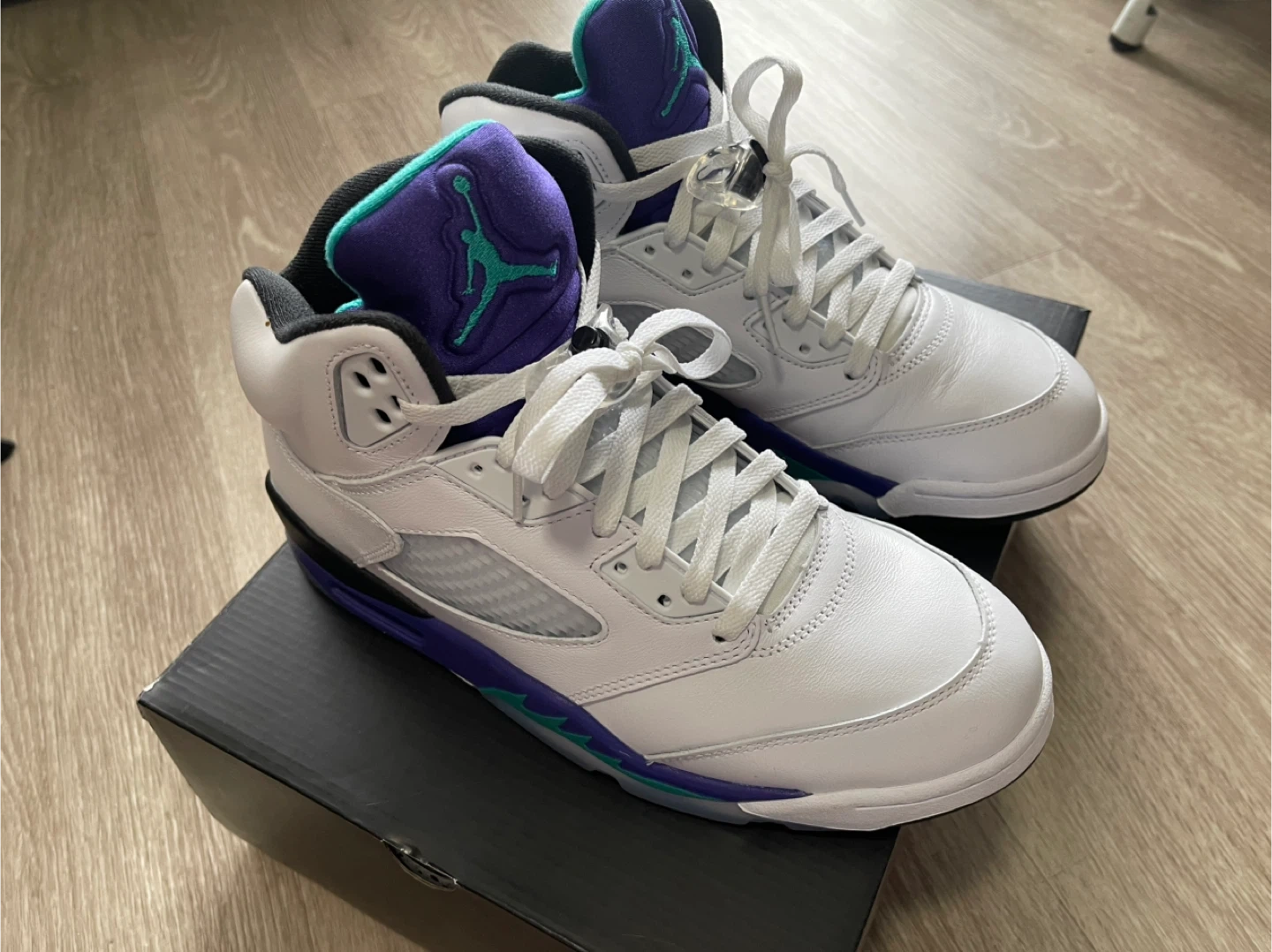 Classic Air Jordan 5 sneakers in the "Grape" colourway. Features white leather uppers with purple and teal accents. Includes original box. These kicks are ready for your collection!