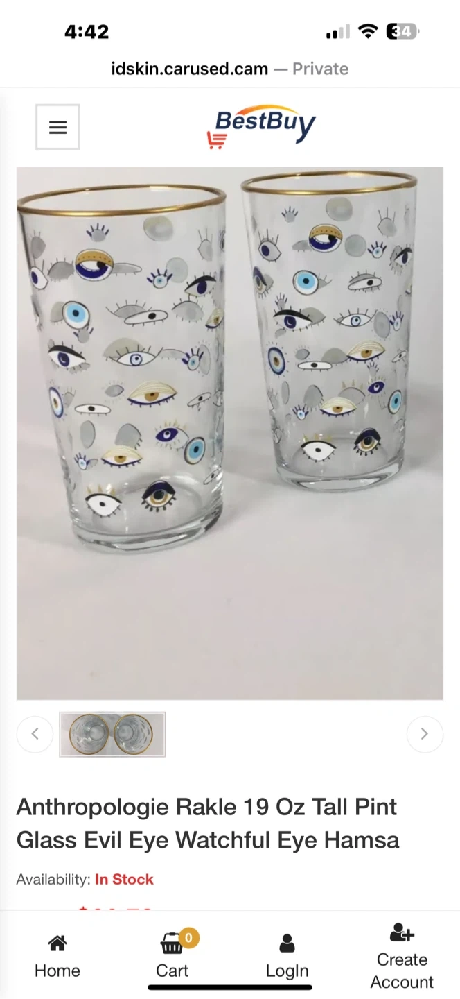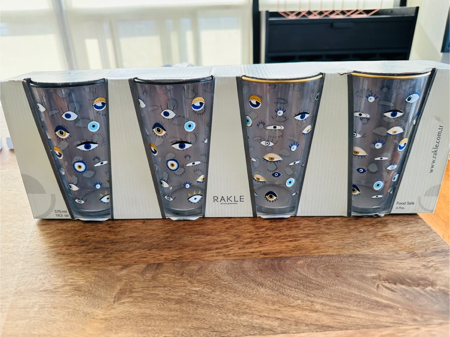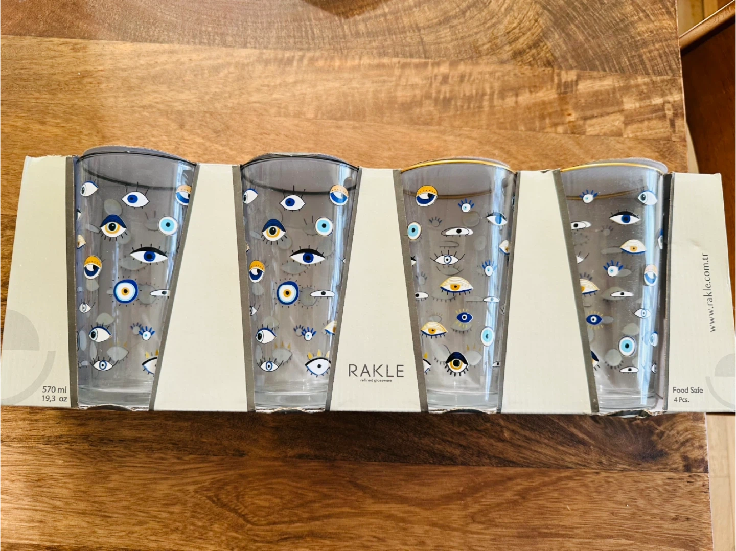 Selling a set of 4 Rakle pint glasses, brand new in the box! These tall glasses feature a unique evil eye design. Each glass holds 570 ml (19.3 oz). They're food safe and ready to use. The box is included!